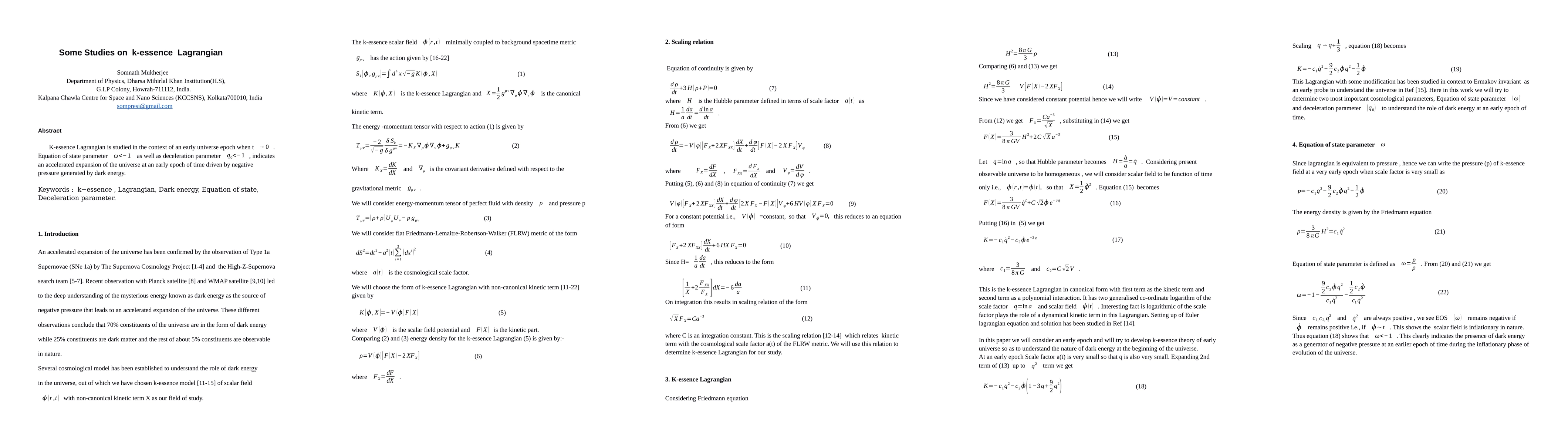 K-essence Lagrangian is studied in the context of an early universe epoch when time is very small. Equation of state parameter as well as deceleration parameter , indicates an accelerated expansion of the universe at an early epoch of time driven by negative pressure generated by dark energy.