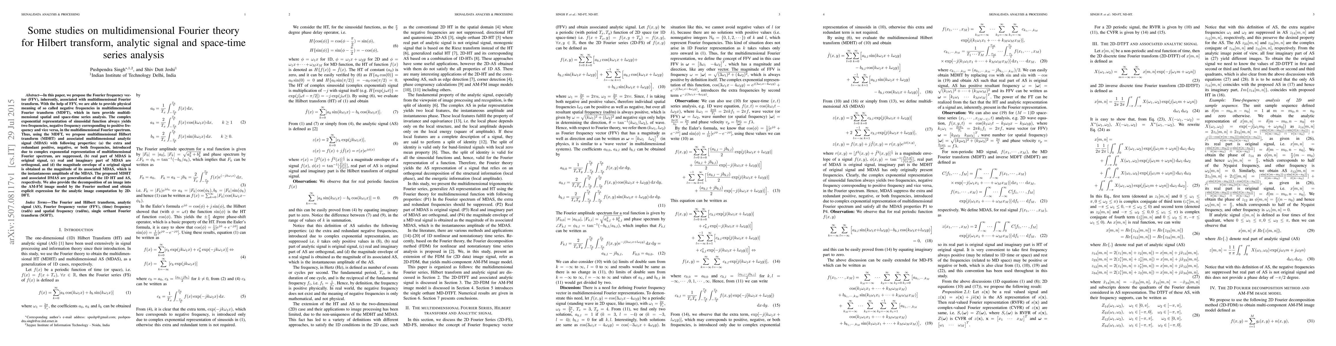 In this paper, we propose the Fourier frequency vector (FFV), inherently, associated with multidimensional Fourier transform. With the help of FFV, we are able to provide physical meaning of so called negative frequencies in multidimensional Fourier transform (MDFT), which in turn provide multidimensional spatial and space-time series analysis. The complex exponential representation of sinusoidal function always yields two frequencies, negative frequency corresponding to positive frequency and vice versa, in the multidimensional Fourier spectrum. Thus, using the MDFT, we propose multidimensional Hilbert transform (MDHT) and associated multidimensional analytic signal (MDAS) with following properties: (a) the extra and redundant positive, negative, or both frequencies, introduced due to complex exponential representation of multidimensional Fourier spectrum, are suppressed, (b) real part of MDAS is original signal, (c) real and imaginary part of MDAS are orthogonal, and (d) the magnitude envelope of a original signal is obtained as the magnitude of its associated MDAS, which is the instantaneous amplitude of the MDAS. The proposed MDHT and associated DMAS are generalization of the 1D HT and AS, respectively. We also provide the decomposition of an image into the AM-FM image model by the Fourier method and obtain explicit expression for the analytic image computation by 2DDFT.