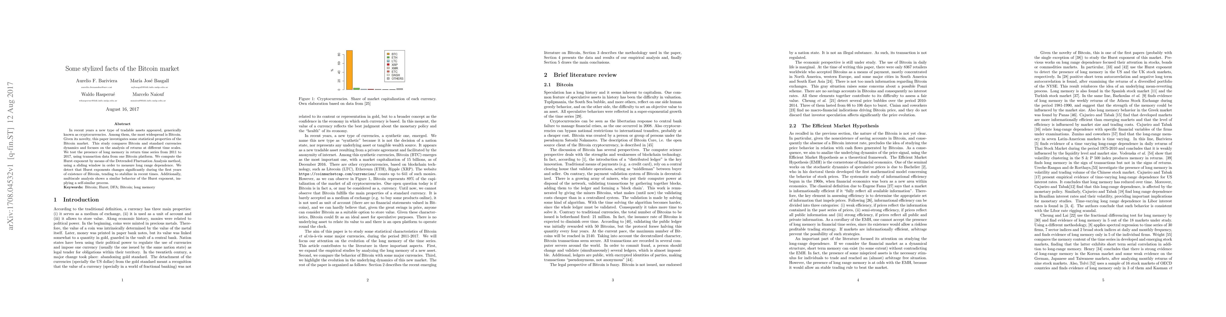 In recent years a new type of tradable assets appeared, generically known as cryptocurrencies. Among them, the most widespread is Bitcoin. Given its novelty, this paper investigates some statistical properties of the Bitcoin market. This study compares Bitcoin and standard currencies dynamics and focuses on the analysis of returns at different time scales. We test the presence of long memory in return time series from 2011 to 2017, using transaction data from one Bitcoin platform. We compute the Hurst exponent by means of the Detrended Fluctuation Analysis method, using a sliding window in order to measure long range dependence. We detect that Hurst exponents changes significantly during the first years of existence of Bitcoin, tending to stabilize in recent times. Additionally, multiscale analysis shows a similar behavior of the Hurst exponent, implying a self-similar process.