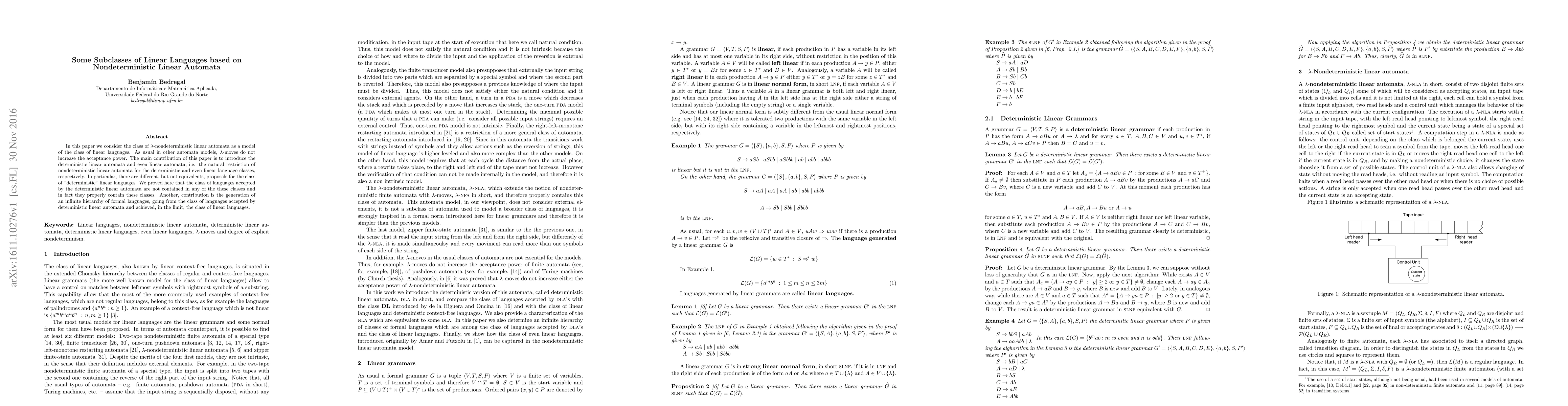 In this paper we consider the class of lambda-nondeterministic linear automata as a model of the class of linear languages. As usual in other automata models, lambda-moves do not increase the acceptance power. The main contribution of this paper is to introduce the deterministic linear automata and even linear automata, i.e. the natural restriction of nondeterministic linear automata for the deterministic and even linear language classes, respectively. In particular, there are different, but not equivalents, proposals for the class of "deterministic" linear languages. We proved here that the class of languages accepted by the deterministic linear automata are not contained in any of the these classes and in fact they properly contain these classes. Another, contribution is the generation of an infinite hierarchy of formal languages, going from the class of languages accepted by deterministic linear automata and achieved, in the limit, the class of linear languages.
