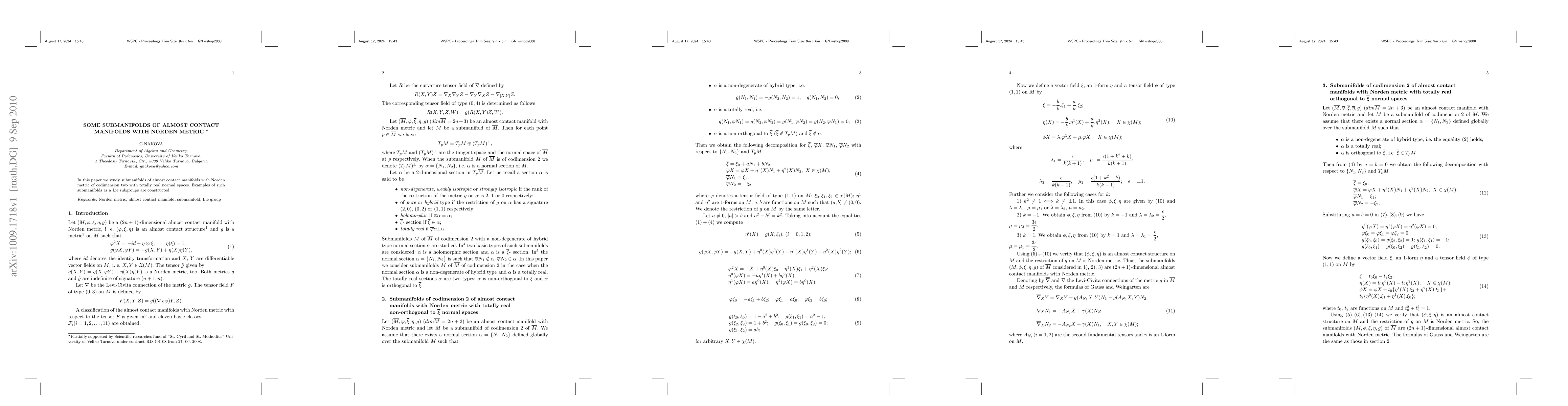 Summary: This paper explores submanifolds of almost contact manifolds equipped with a Norden metric, focusing on codimension two submanifolds with totally real normal spaces, and constructs examples using Lie subgroups.