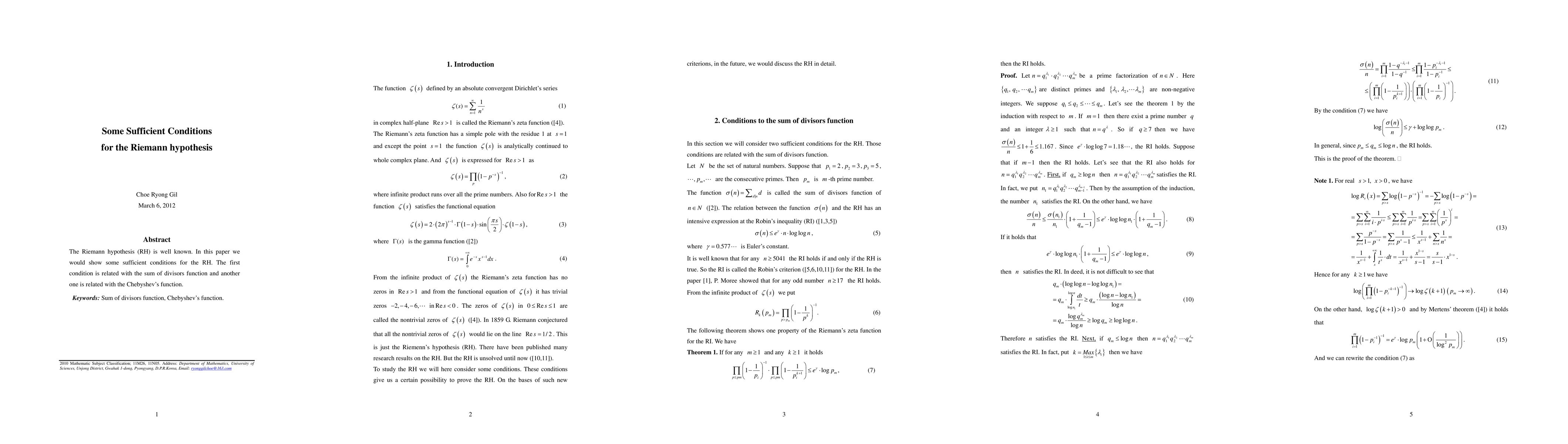 Summary: This paper presents sufficient conditions for the Riemann hypothesis, focusing on relationships involving the sum of divisors function and Chebyshev's function. These conditions provide new insights into the potential validity of the hypothesis.