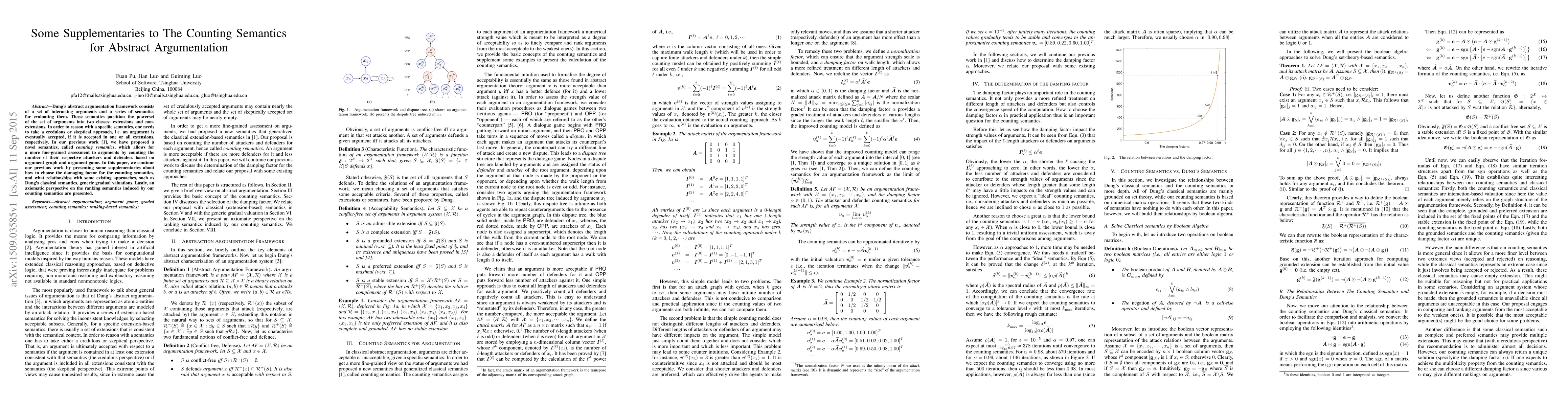 Dung's abstract argumentation framework consists of a set of interacting arguments and a series of semantics for evaluating them. Those semantics partition the powerset of the set of arguments into two classes: extensions and non-extensions. In order to reason with a specific semantics, one needs to take a credulous or skeptical approach, i.e. an argument is eventually accepted, if it is accepted in one or all extensions, respectively. In our previous work \cite{ref-pu2015counting}, we have proposed a novel semantics, called \emph{counting semantics}, which allows for a more fine-grained assessment to arguments by counting the number of their respective attackers and defenders based on argument graph and argument game. In this paper, we continue our previous work by presenting some supplementaries about how to choose the damaging factor for the counting semantics, and what relationships with some existing approaches, such as Dung's classical semantics, generic gradual valuations. Lastly, an axiomatic perspective on the ranking semantics induced by our counting semantics are presented.