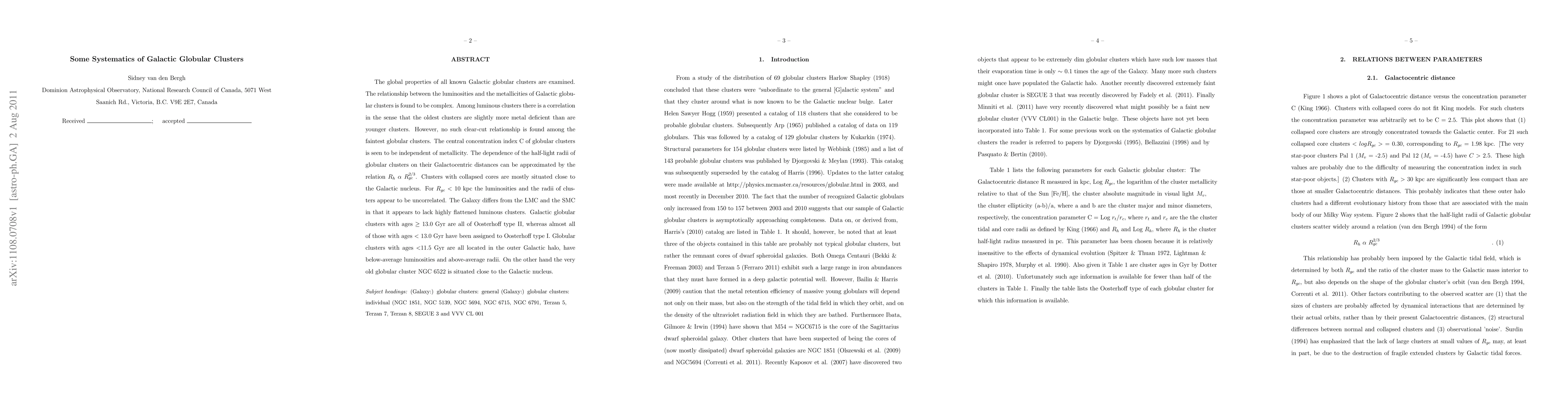 This paper examines the global properties of Galactic globular clusters, revealing a complex relationship between luminosity and metallicity, with older clusters being slightly more metal-deficient. It finds no clear correlation in the faintest clusters and notes that the central concentration index is independent of metallicity. The study also identifies a relation between half-light radii and Galactocentric distances, and highlights differences in cluster characteristics compared to the LMC and SMC.
