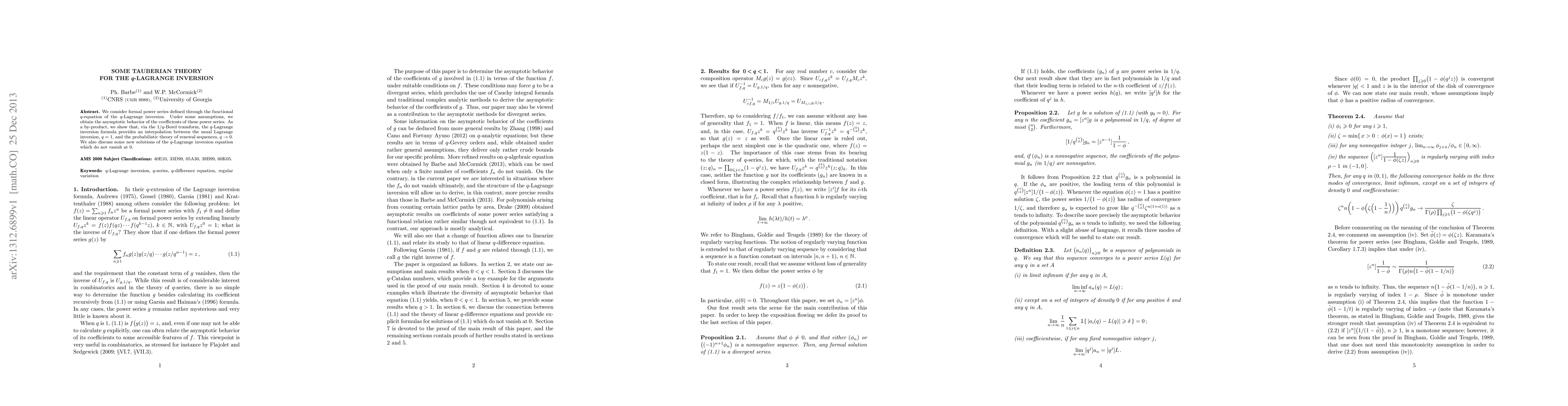 This paper investigates formal power series via the functional q-equation of q-Lagrange inversion, deriving the asymptotic behavior of their coefficients. It demonstrates an interpolation between Lagrange inversion and renewal sequence theory using the 1/q-Borel transform, and presents new non-vanishing solutions of the q-Lagrange inversion equation.