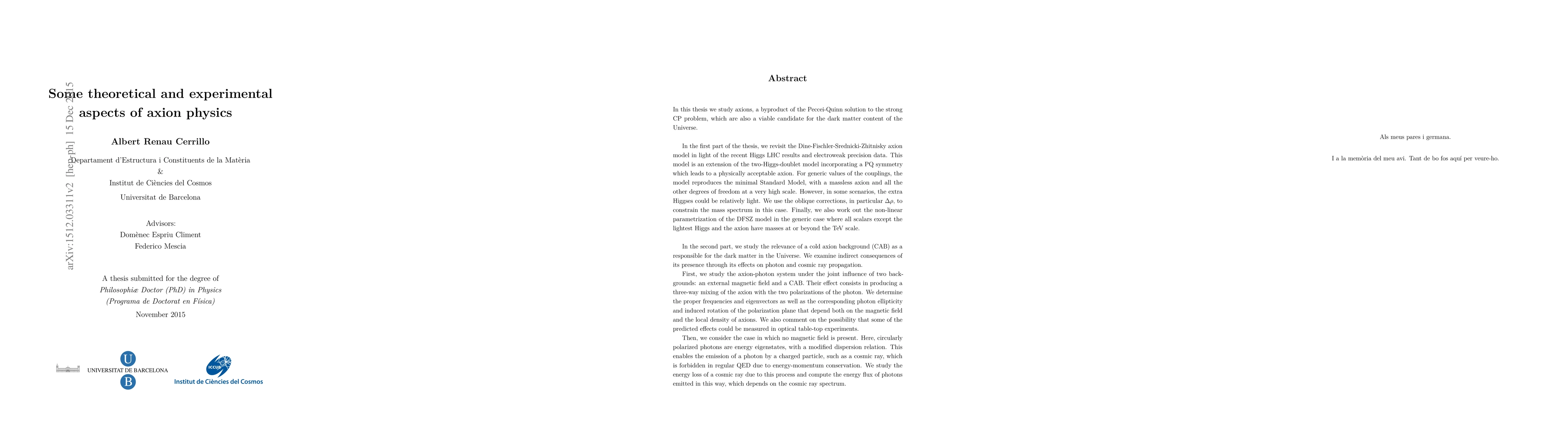 In the first part of the thesis, we revisit the Dine-Fischler-Srednicki-Zhitnisky axion model in light of the recent Higgs LHC results and electroweak precision data. This model is an extension of the two-Higgs-doublet model incorporating a PQ symmetry which leads to a physically acceptable axion. For generic values of the couplings, the model reproduces the minimal Standard Model, with a massless axion and all the other degrees of freedom at a very high scale. However, in some scenarios, the extra Higgses could be relatively light. We use the oblique corrections, in particular $\Delta\rho$, to constrain the mass spectrum in this case. Finally, we also work out the non-linear parametrization of the DFSZ model in the generic case where all scalars except the lightest Higgs and the axion have masses at or beyond the TeV scale. In the second part, we study the relevance of a cold axion background (CAB) as a responsible for the dark matter in the Universe and examine its consequences through its effects on photon and cosmic ray propagation. We study the axion-photon system under the joint influence of two backgrounds: an external magnetic field and a CAB. Their effect consists in producing a three-way mixing of the axion with the two polarizations of the photon. We determine the proper frequencies and eigenvectors as well as the corresponding photon ellipticity and induced rotation of the polarization plane that depend both on the magnetic field and the local density of axions. We also comment on the possibility that some of the predicted effects could be measured in optical table-top experiments. Circularly polarized photons are energy eigenstates, with a modified dispersion relation. This enables the emission of a photon by a charged particle, which is forbidden in regular QED. We study the energy loss of a cosmic ray due and compute the energy flux of photons emitted in this way.