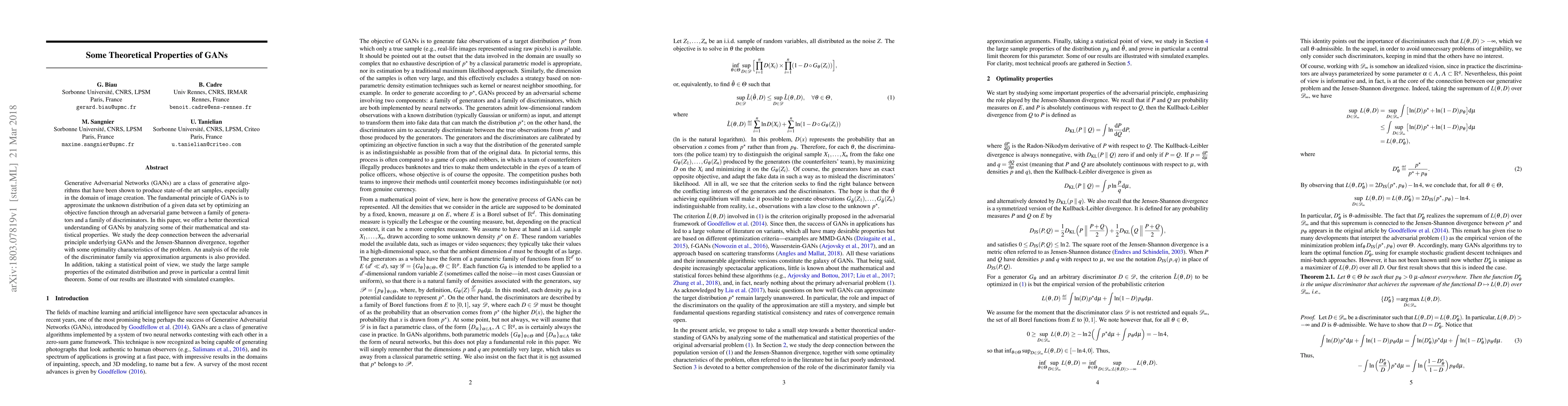 Generative Adversarial Networks (GANs) are a class of generative algorithms that have been shown to produce state-of-the art samples, especially in the domain of image creation. The fundamental principle of GANs is to approximate the unknown distribution of a given data set by optimizing an objective function through an adversarial game between a family of generators and a family of discriminators. In this paper, we offer a better theoretical understanding of GANs by analyzing some of their mathematical and statistical properties. We study the deep connection between the adversarial principle underlying GANs and the Jensen-Shannon divergence, together with some optimality characteristics of the problem. An analysis of the role of the discriminator family via approximation arguments is also provided. In addition, taking a statistical point of view, we study the large sample properties of the estimated distribution and prove in particular a central limit theorem. Some of our results are illustrated with simulated examples.