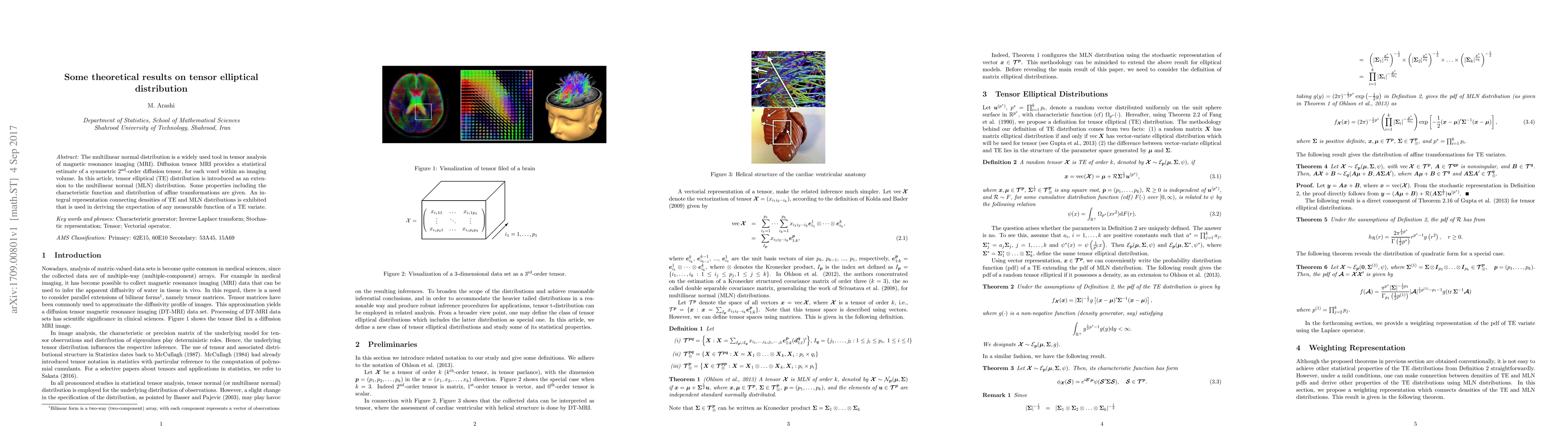 The multilinear normal distribution is a widely used tool in tensor analysis of magnetic resonance imaging (MRI). Diffusion tensor MRI provides a statistical estimate of a symmetric 2nd-order diffusion tensor, for each voxel within an imaging volume. In this article, tensor elliptical (TE) distribution is introduced as an extension to the multilinear normal (MLN) distribution. Some properties including the characteristic function and distribution of affine transformations are given. An integral representation connecting densities of TE and MLN distributions is exhibited that is used in deriving the expectation of any measurable function of a TE variate.