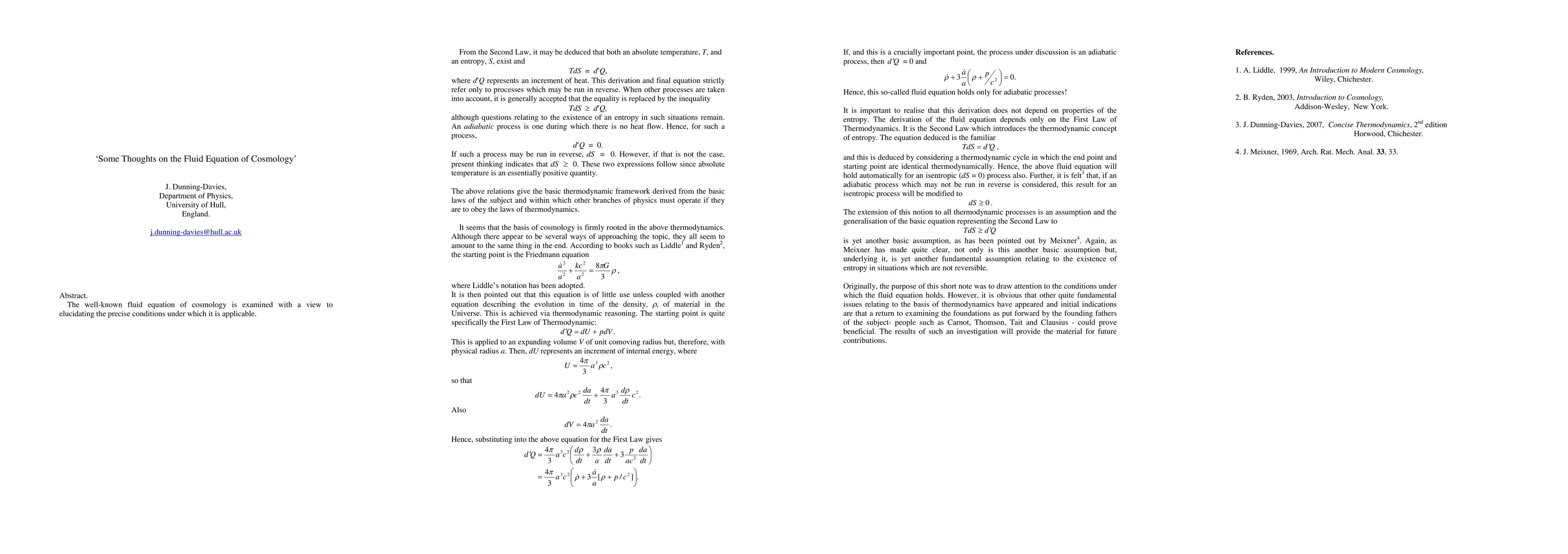 The well-known fluid equation of cosmology is examined with a view to elucidating the precise conditions under which it is applicable.