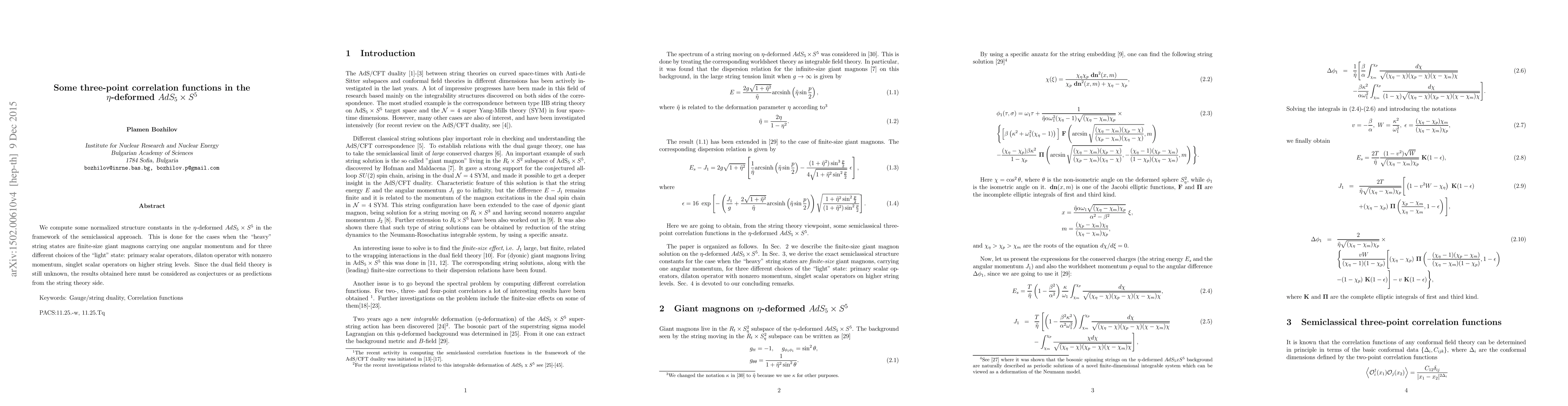 Summary: This research calculates three-point correlation functions within the framework of $\eta$-deformed AdS$_5$ x S$^5$ using a semiclassical approach, focusing on finite-size giant magnons and various "light" states. The findings, though linked to a dual field theory, remain conjectural or predictive for string theory. Keywords: Gauge/string duality, Correlation functions