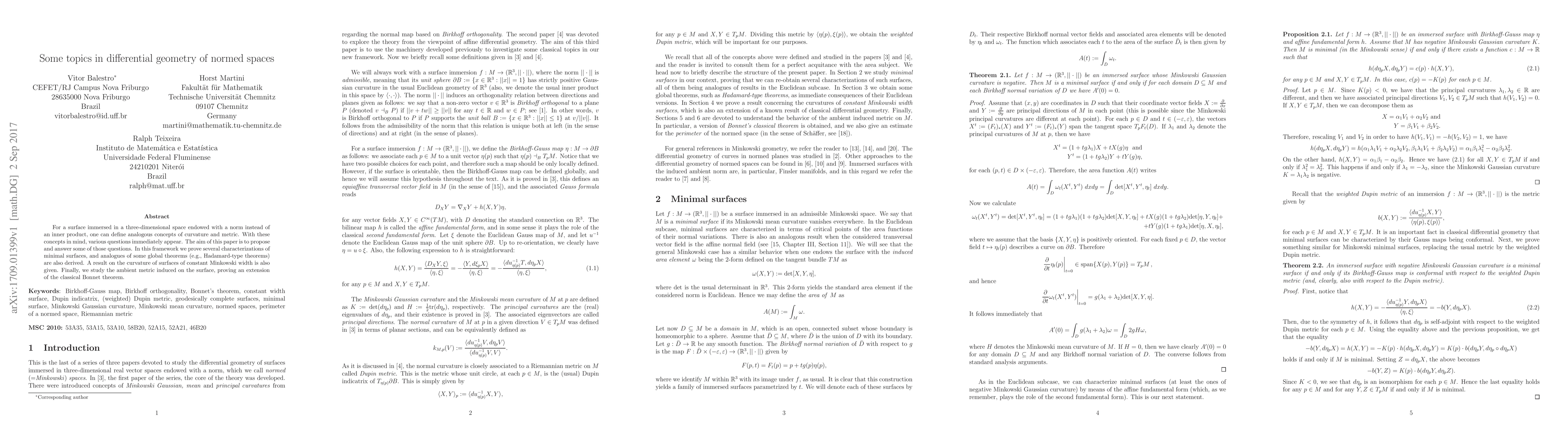 For a surface immersed in a three-dimensional space endowed with a norm instead of an inner product, one can define analogous concepts of curvature and metric. With these concepts in mind, various questions immediately appear. The aim of this paper is to propose and answer some of those questions. In this framework we prove several characterizations of minimal surfaces, and analogues of some global theorems (e.g., Hadamard-type theorems) are also derived. A result on the curvature of surfaces of constant Minkowski width is also given. Finally, we study the ambient metric induced on the surface, proving an extension of the classical Bonnet theorem.