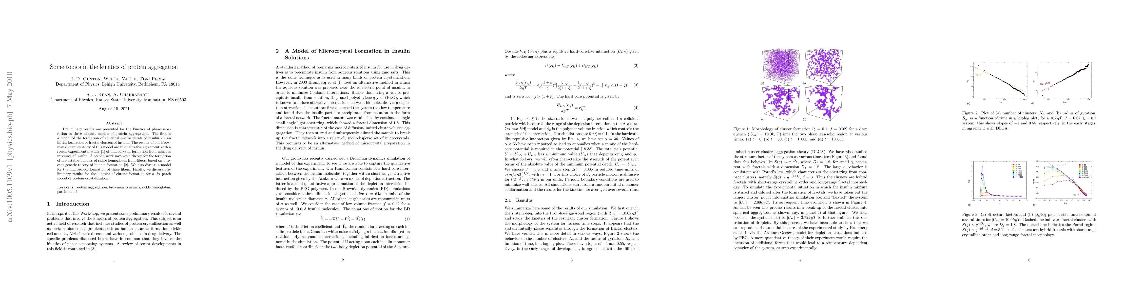 This paper presents preliminary kinetic studies on protein aggregation in three models: spherical insulin microcrystals forming via fractal clusters, metastable sickle hemoglobin bundles from fibers, and cluster formation in a six-patch protein crystallization model. The insulin model's dynamics align with recent experimental findings.