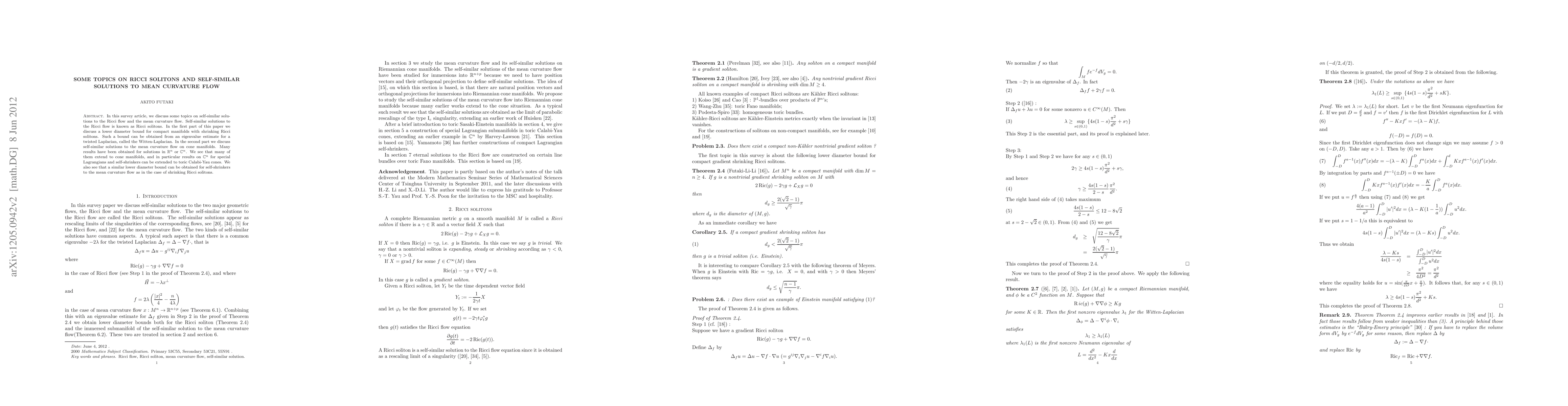 This paper surveys self-similar solutions, known as Ricci solitons, to the Ricci flow and their extensions to mean curvature flow. It establishes a lower diameter bound for compact manifolds with shrinking Ricci solitons, utilizing eigenvalue estimates from the Witten-Laplacian. Additionally, it extends results from self-similar solutions in $\bfR^n$ and $\bfC^n$ to cone manifolds, particularly toric Calabi-Yau cones, and derives a similar lower diameter bound for self-shrinkers in mean curvature flow.