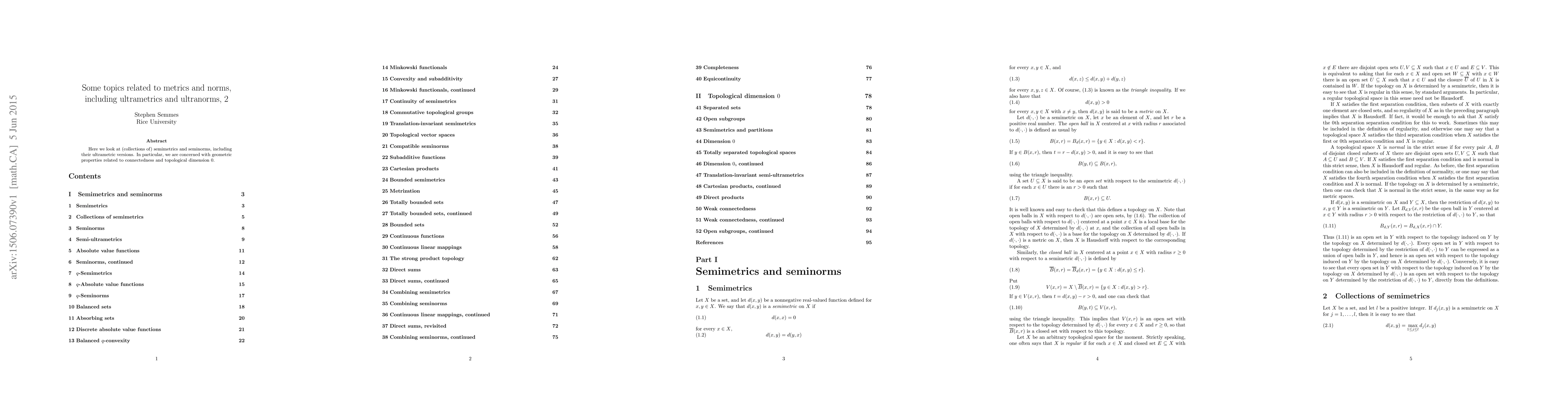 Here we look at (collections of) semimetrics and seminorms, including their ultrametric versions. In particular, we are concerned with geometric properties related to connectedness and topological dimension 0.