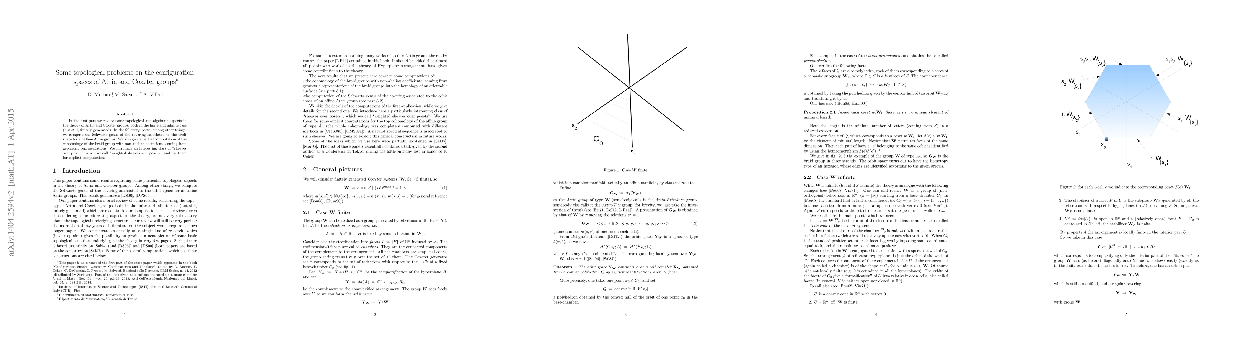 In the first part we review some topological and algebraic aspects in the theory of Artin and Coxeter groups, both in the finite and infinite case (but still, finitely generated). In the following parts, among other things, we compute the Schwartz genus of the covering associated to the orbit space for all affine Artin groups. We also give a partial computation of the cohomology of the braid group with non-abelian coefficients coming from geometric representations. We introduce an interesting class of "sheaves over posets", which we call "weighted sheaves over posets", and use them for explicit computations.
