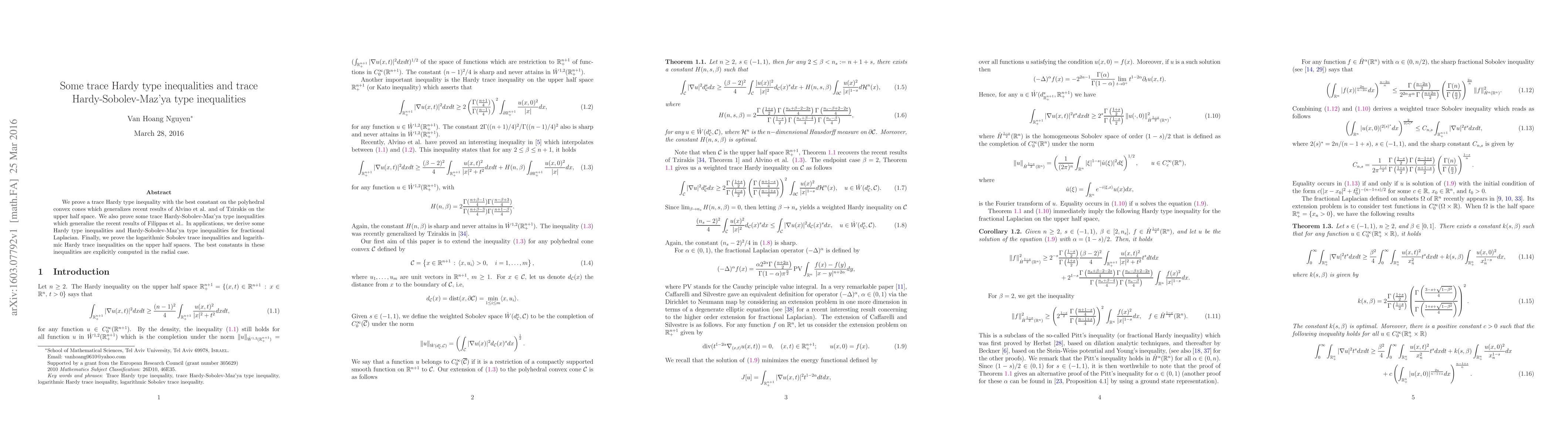 This paper proves trace Hardy type inequalities on polyhedral convex cones and trace Hardy-Sobolev-Maz'ya type inequalities, generalizing previous results. It also derives Hardy type inequalities for fractional Laplacian and proves logarithmic Sobolev trace inequalities with explicit best constants in the radial case.