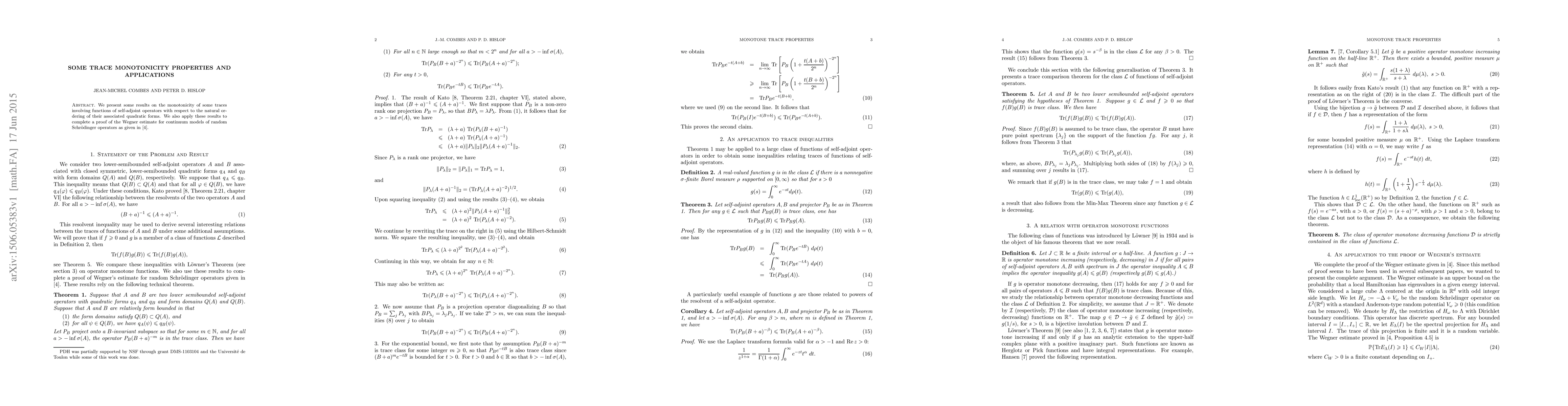 Summary: This paper explores monotonicity properties of traces related to self-adjoint operators and applies these findings to finalize the proof of the Wegner estimate for continuum models of random Schrödinger operators.