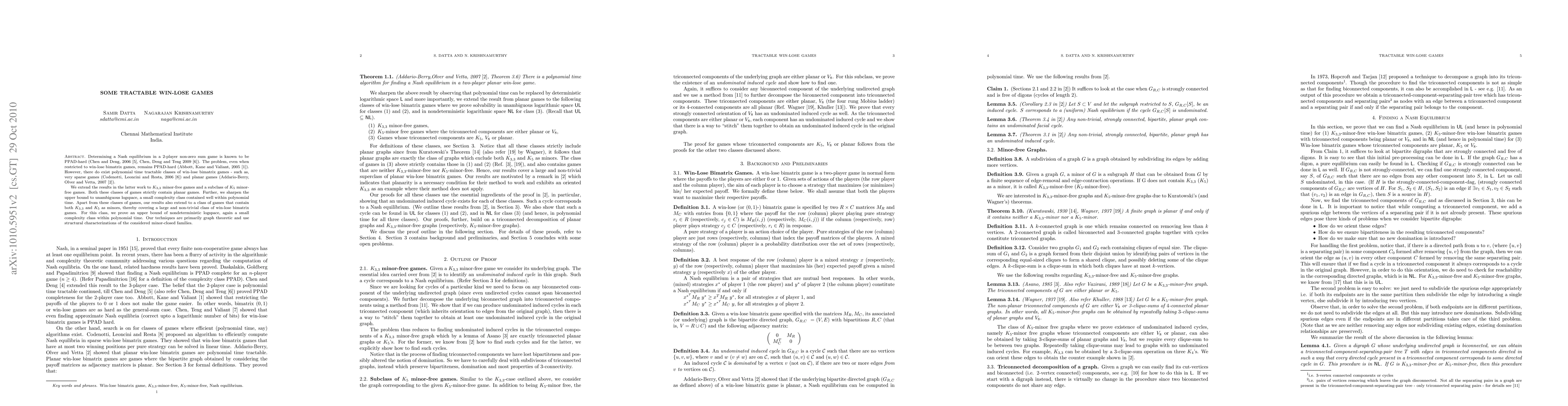 This paper explores tractable classes of win-lose bimatrix games, extending previous results to $K_{3,3}$ and $K_5$ minor-free games, and achieving upper bounds in unambiguous logspace and nondeterministic logspace, respectively. The techniques leverage structural graph theory.