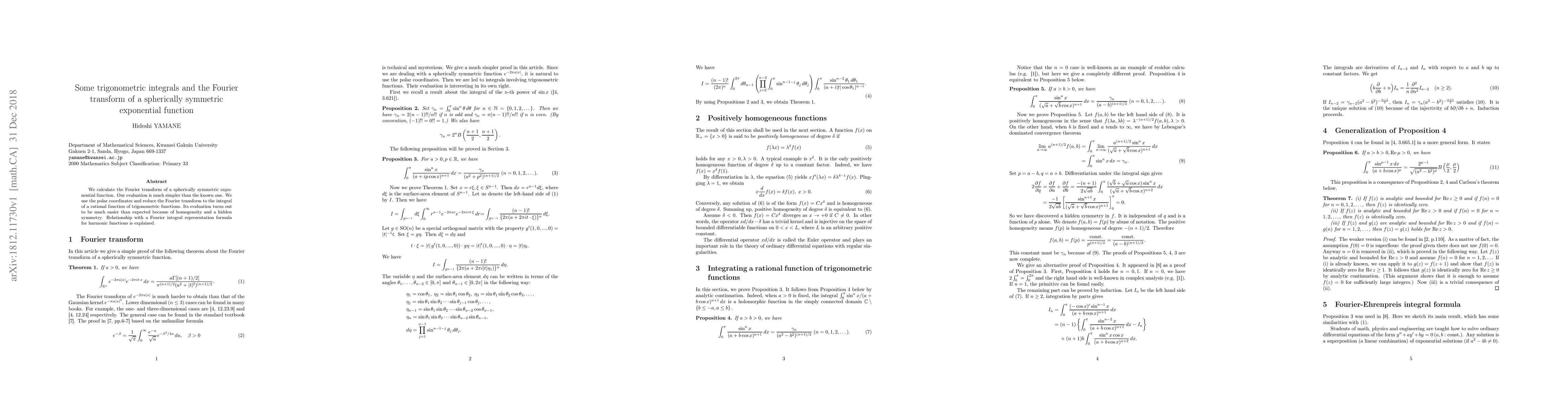 Summary: This paper presents a simplified method for calculating the Fourier transform of a spherically symmetric exponential function, utilizing polar coordinates and revealing hidden symmetries that ease the evaluation of the resulting trigonometric integrals. The approach is compared to known methods and linked to Fourier integral representations of harmonic functions.