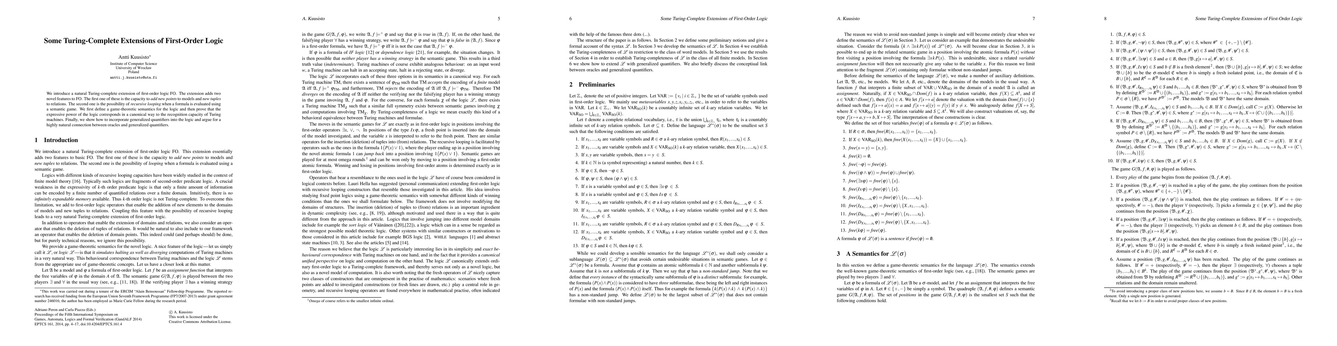 This paper presents a Turing-complete extension of first-order logic, introducing features for adding new points and tuples, and recursive looping via semantic games. The authors demonstrate the logic's equivalence to the recognition capacity of Turing machines and discuss the integration of generalized quantifiers.