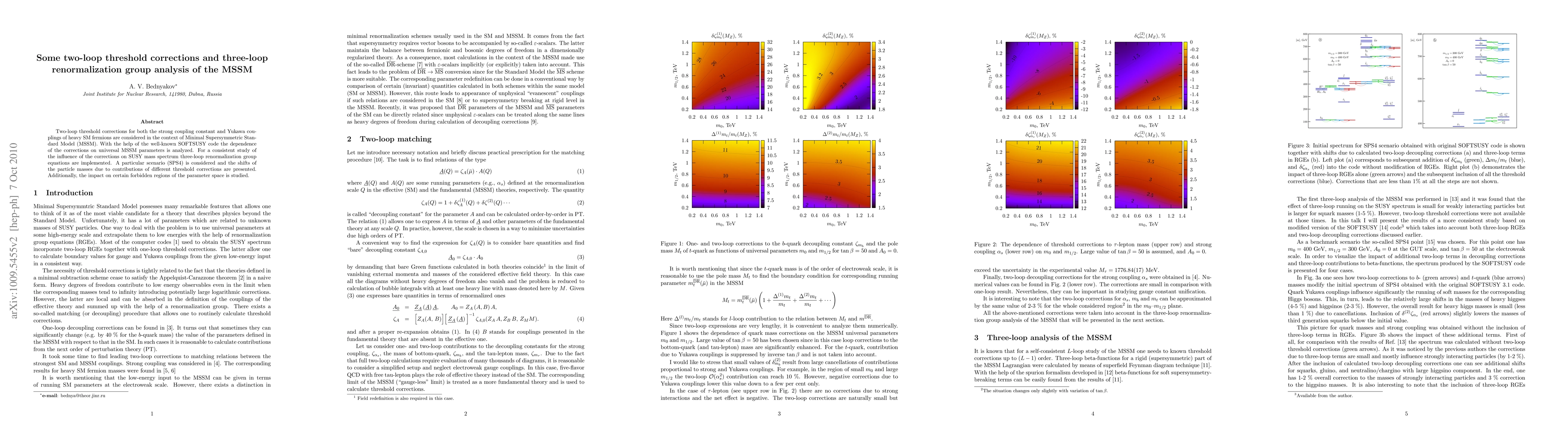 This paper investigates two-loop threshold corrections for the strong coupling and Yukawa couplings in the MSSM, employing the SOFTSUSY code to analyze their dependence on universal MSSM parameters. It also implements three-loop RGEs to study the impact on the SUSY mass spectrum, particularly in scenario SPS4, and examines shifts in particle masses and forbidden regions in the parameter space.
