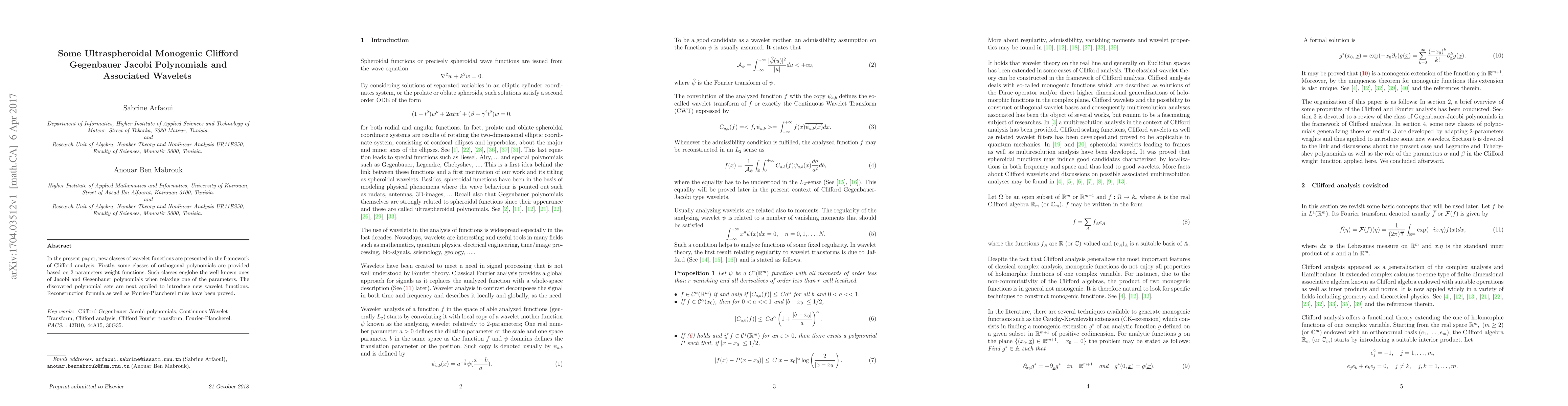 In the present paper, new classes of wavelet functions are presented in the framework of Clifford analysis. Firstly, some classes of orthogonal polynomials are provided based on 2-parameters weight functions. Such classes englobe the well known ones of Jacobi and Gegenbauer polynomials when relaxing one of the parameters. The discovered polynomial sets are next applied to introduce new wavelet functions. Reconstruction formula as well as Fourier-Plancherel rules have been proved.