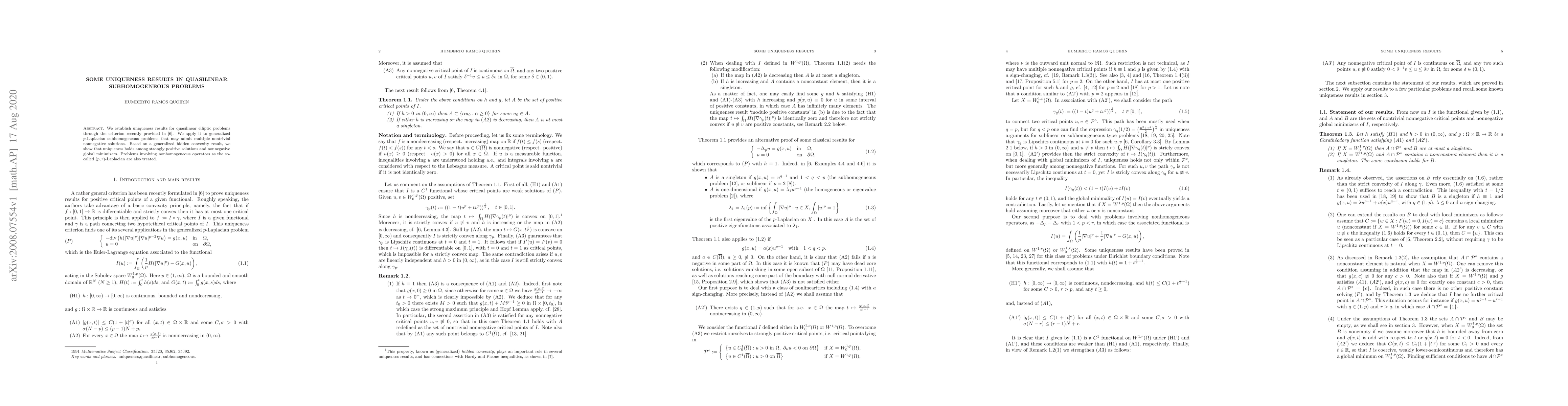 This paper establishes uniqueness for quasilinear elliptic problems using a criterion from \cite{DFMST}, demonstrating that generalized $p$-Laplacian subhomogeneous problems, which can have multiple solutions, uniquely determine strongly positive solutions and nonnegative global minimizers. Nonhomogeneous operators like $(p,r)$-Laplacians are also considered.