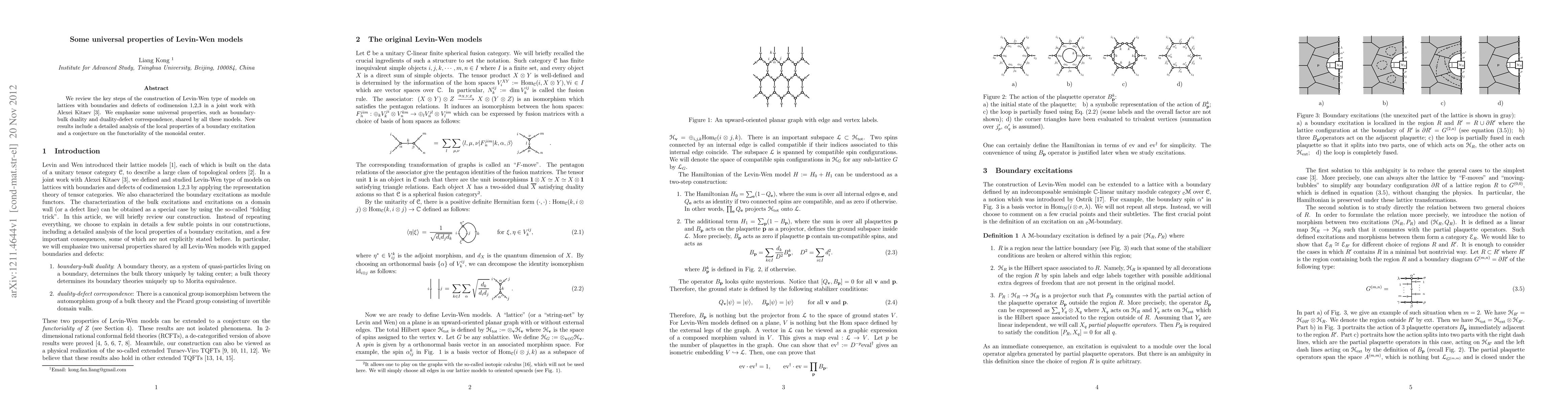This paper reviews the construction of Levin-Wen models on lattices with various defects, highlighting universal properties like boundary-bulk duality and duality-defect correspondence. It also presents new analyses of boundary excitations and a conjecture regarding the functoriality of the monoidal center.