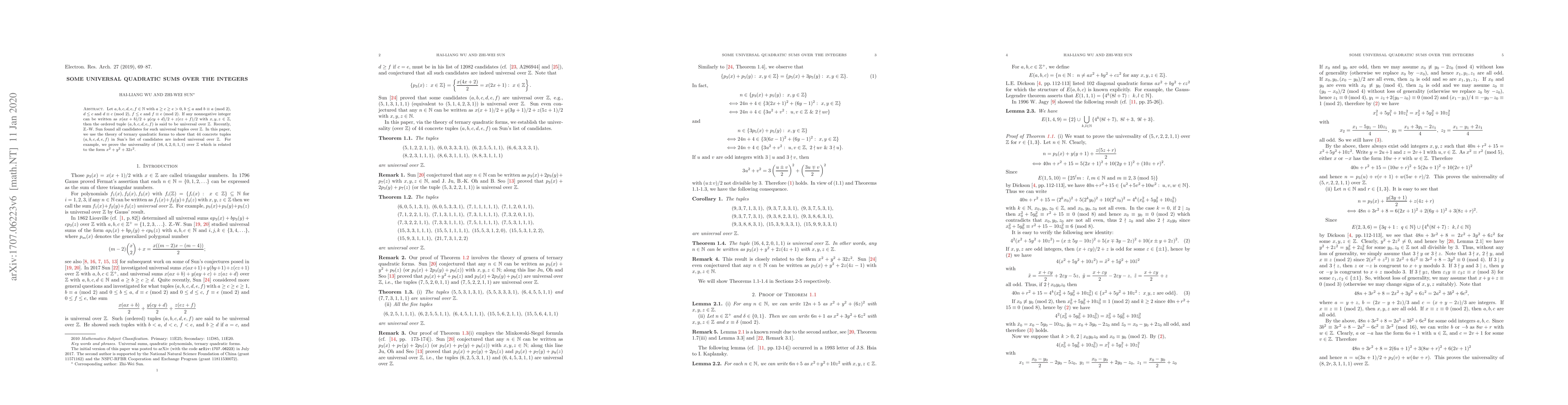 Let $a,b,c,d,e,f\in\mathbb N$ with $a\ge c\ge e>0$, $b\le a$ and $b\equiv a\pmod2$, $d\le c$ and $d\equiv c\pmod2$, $f\le e$ and $f\equiv e\pmod2$. If any nonnegative integer can be written as $x(ax+b)/2+y(cy+d)/2+z(ez+f)/2$ with $x,y,z\in\mathbb Z$, then the ordered tuple $(a,b,c,d,e,f)$ is said to be universal over $\mathbb Z$. Recently, Z.-W. Sun found all candidates for such universal tuples over $\mathbb Z$. In this paper, we use the theory of ternary quadratic forms to show that 44 concrete tuples $(a,b,c,d,e,f)$ in Sun's list of candidates are indeed universal over $\mathbb Z$. For example, we prove the universality of $(16,4,2,0,1,1)$ over $\mathbb Z$ which is related to the form $x^2+y^2+32z^2$.