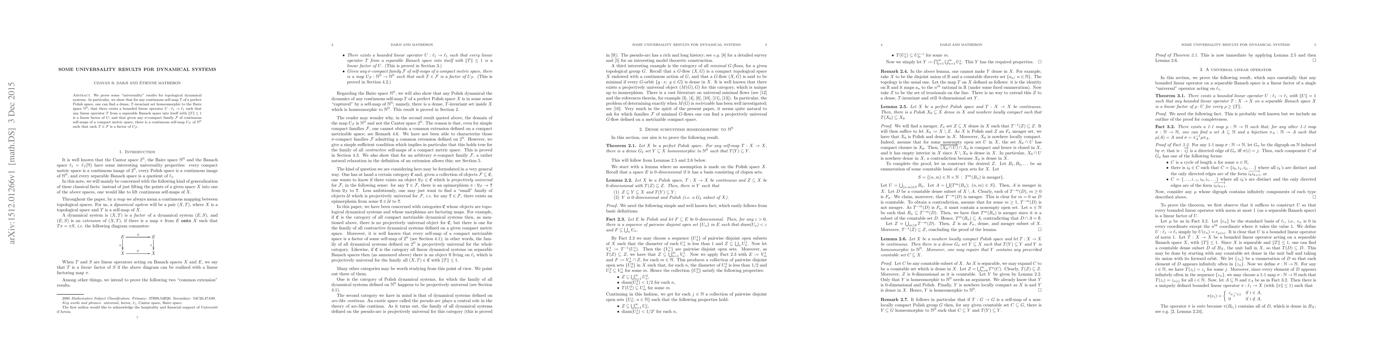 We prove some "universality" results for topological dynamical systems. In particular, we show that for any continuous self-map $T$ of a perfect Polish space, one can find a dense, $T$-invariant set homeomorphic to the Baire space ${\mathbb N}^{\mathbb N}$; that there exists a bounded linear operator $U: \ell_1 \rightarrow \ell_1$ such that any linear operator $T$ from a separable Banach space into itself with $\Vert T\Vert\leq 1$ is a linear factor of $U$; and that given any $\sigma$-compact family ${\mathcal F}$ of continuous self-maps of a compact metric space, there is a continuous self-map $U_{\mathcal F}$ of ${\mathbb N}^{\mathbb N}$ such that each $T\in {\mathcal F}$ is a factor of $U_{\mathcal F}$.