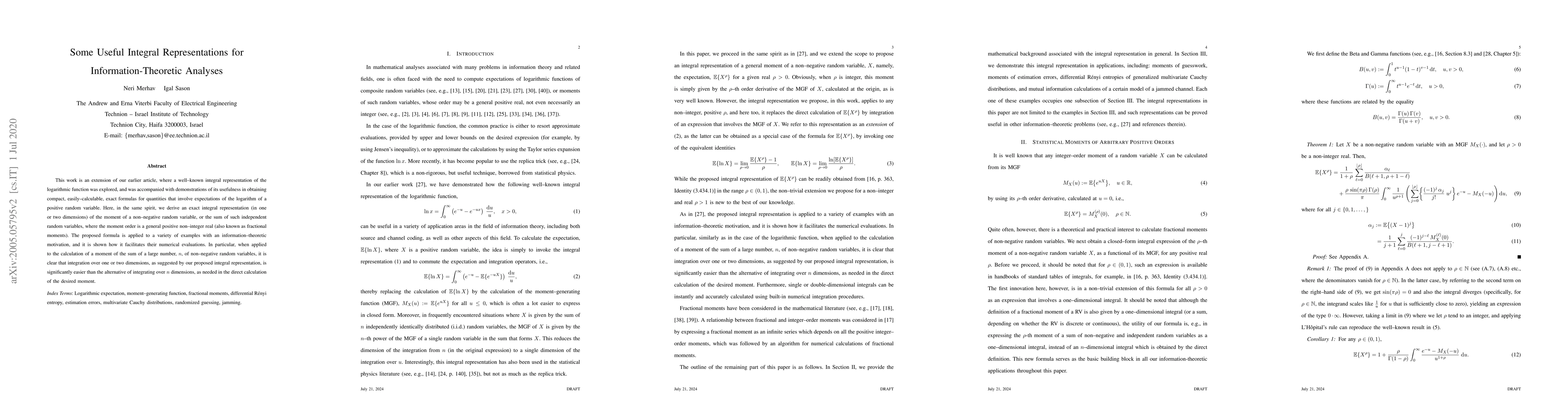 This work is an extension of our earlier article, where a well-known integral representation of the logarithmic function was explored, and was accompanied with demonstrations of its usefulness in obtaining compact, easily-calculable, exact formulas for quantities that involve expectations of the logarithm of a positive random variable. Here, in the same spirit, we derive an exact integral representation (in one or two dimensions) of the moment of a nonnegative random variable, or the sum of such independent random variables, where the moment order is a general positive noninteger real (also known as fractional moments). The proposed formula is applied to a variety of examples with an information-theoretic motivation, and it is shown how it facilitates their numerical evaluations. In particular, when applied to the calculation of a moment of the sum of a large number, $n$, of nonnegative random variables, it is clear that integration over one or two dimensions, as suggested by our proposed integral representation, is significantly easier than the alternative of integrating over $n$ dimensions, as needed in the direct calculation of the desired moment.