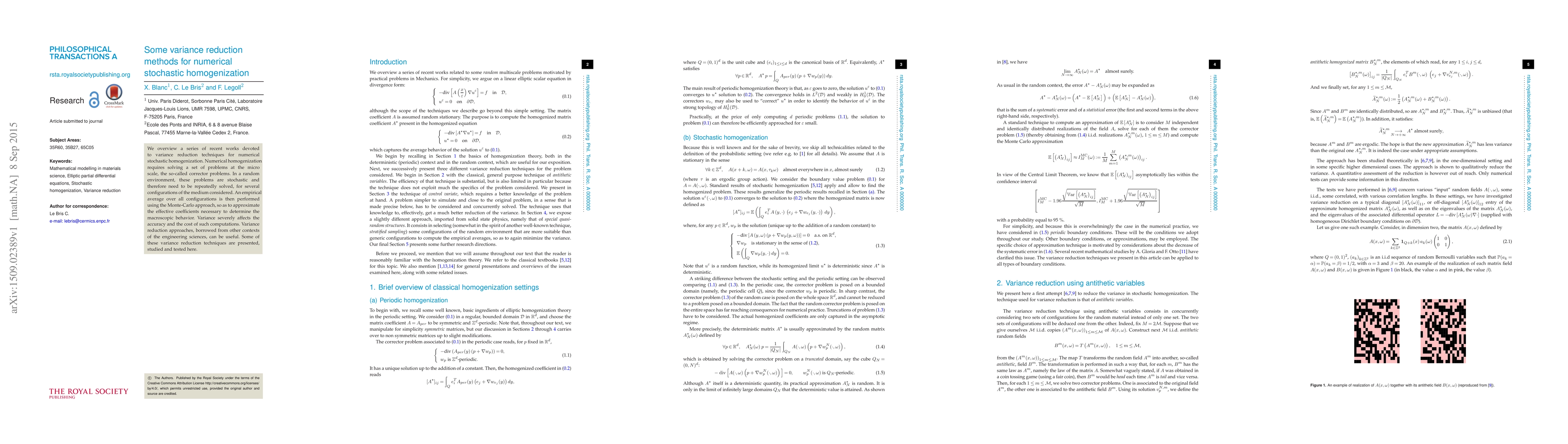 This paper reviews recent variance reduction techniques for numerical stochastic homogenization, focusing on methods to improve the accuracy and efficiency of solving micro-scale corrector problems in random environments. These techniques aim to reduce the variance in Monte-Carlo simulations used to approximate effective macroscopic coefficients.