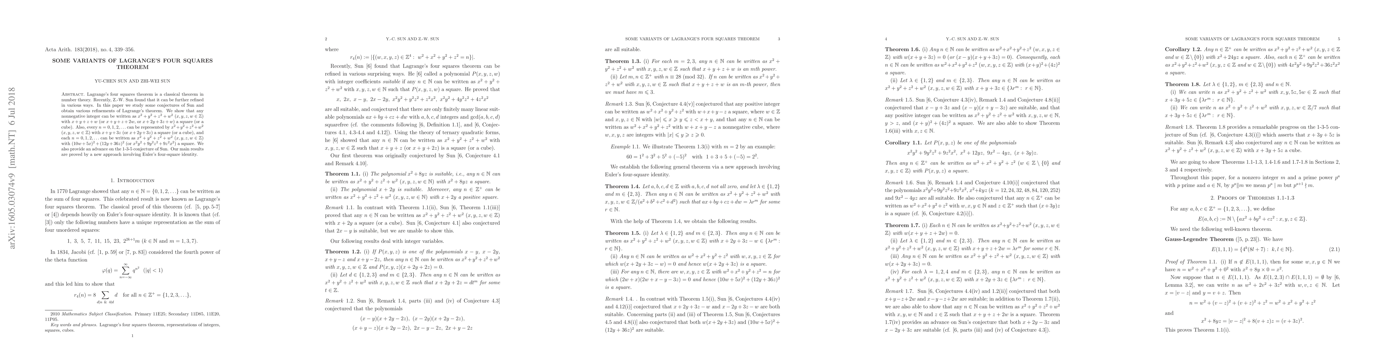 Lagrange's four squares theorem is a classical theorem in number theory. Recently, Z.-W. Sun found that it can be further refined in various ways. In this paper we study some conjectures of Sun and obtain various refinements of Lagrange's theorem. We show that any nonnegative integer can be written as $x^2+y^2+z^2+w^2$ $(x,y,z,w\in\mathbb Z)$ with $x+y+z+w$ (or $x+y+z+2w$, or $x+2y+3z+w$) a square (or a cube). Also, every $n=0,1,2,\ldots$ can be represented by $x^2+y^2+z^2+w^2$ $(x,y,z,w\in\mathbb Z)$ with $x+y+3z$ (or $x+2y+3z$) a square (or a cube), and each $n=0,1,2,\ldots$ can be written as $x^2+y^2+z^2+w^2$ $(x,y,z,w\in\mathbb Z)$ with $(10w+5x)^2+(12y+36z)^2$ (or $x^2y^2+9y^2z^2+9z^2x^2$) a square. We also provide an advance on the 1-3-5 conjecture of Sun. Our main results are proved by a new approach involving Euler's four-square identity