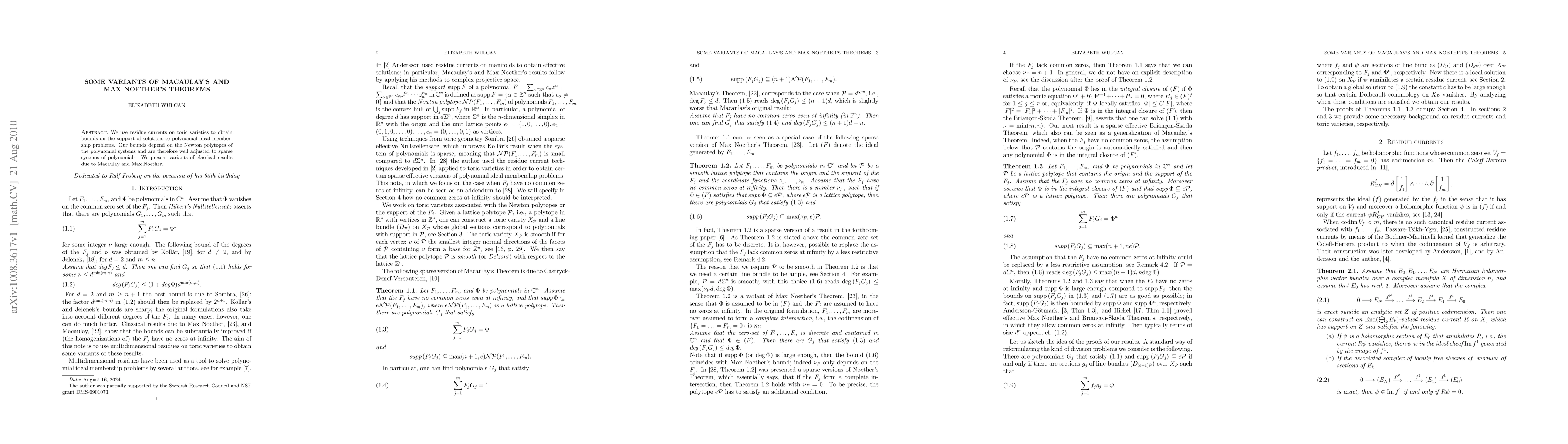 Researchers used residue currents on toric varieties to establish bounds for polynomial ideal membership problems, focusing on sparse systems of polynomials. They also presented variants of classical results by Macaulay and Max Noether.