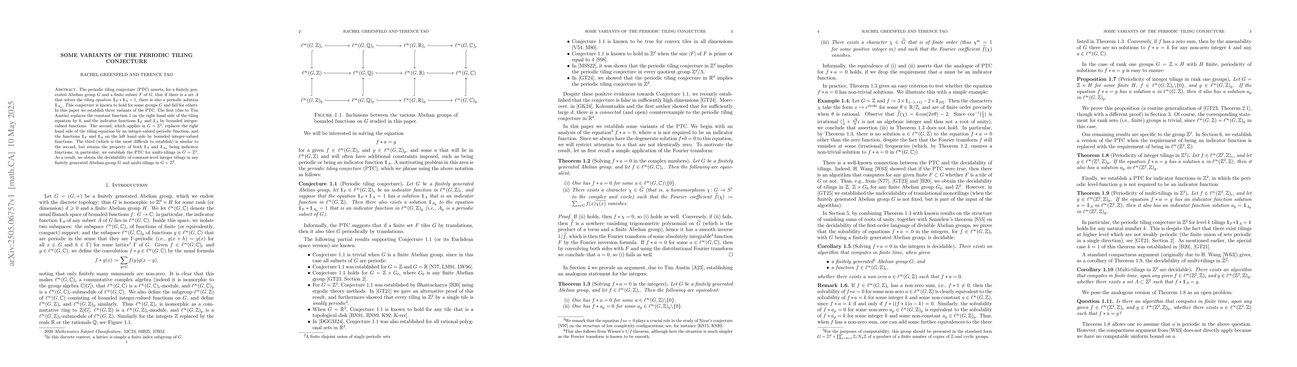 The periodic tiling conjecture (PTC) asserts, for a finitely generated Abelian group $G$ and a finite subset $F$ of $G$, that if there is a set $A$ that solves the tiling equation $\mathbb{1}_F * \mathbb{1}_A = 1$, there is also a periodic solution $\mathbb{1}_{A_{\mathrm{p}}}$. This conjecture is known to hold for some groups $G$ and fail for others. In this paper we establish three variants of the PTC. The first (due to Tim Austin) replaces the constant function $1$ on the right-hand side of the tiling equation by $0$, and the indicator functions $\mathbb{1}_F$ and $\mathbb{1}_A$ by bounded integer-valued functions. The second, which applies in $G=\mathbb{Z}^2$, replaces the right-hand side of the tiling equation by an integer-valued periodic function, and the functions $\mathbb{1}_F$ and $\mathbb{1}_A$ on the left-hand side by bounded integer-valued functions. The third (which is the most difficult to establish) is similar to the second, but retains the property of both $\mathbb{1}_A$ and $\mathbb{1}_{A_{\mathrm{p}}}$ being indicator functions; in particular, we establish the PTC for multi-tilings in $G=\mathbb{Z}^2$. As a result, we obtain the decidability of constant-level integer tilings in any finitely generated Abelian group $G$ and multi-tilings in $G=\mathbb{Z}^2$.