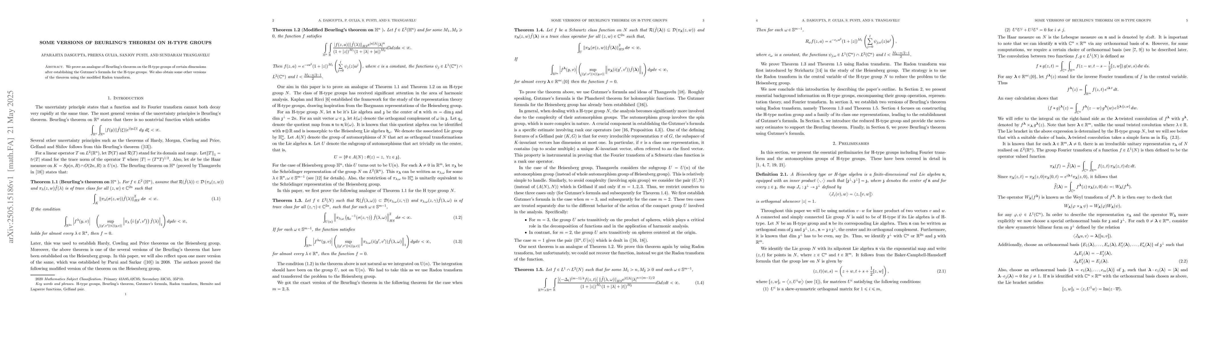 The development of Gutzmer's formula for H-type groups and its application in proving versions of Beurling's theorem using the modified Radon transform.