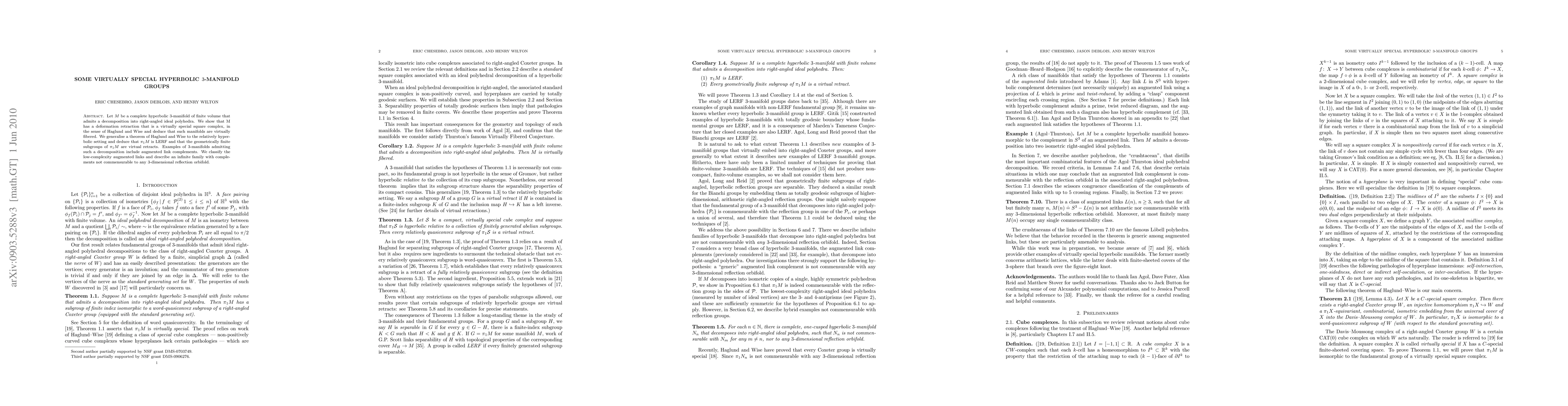 The paper demonstrates that certain hyperbolic 3-manifolds, specifically those that can be decomposed into right-angled ideal polyhedra, have a virtually special square complex deformation retraction and are virtually fibered. It also generalizes a theorem to show that their fundamental groups are LERF and geometrically finite subgroups are virtual retracts.