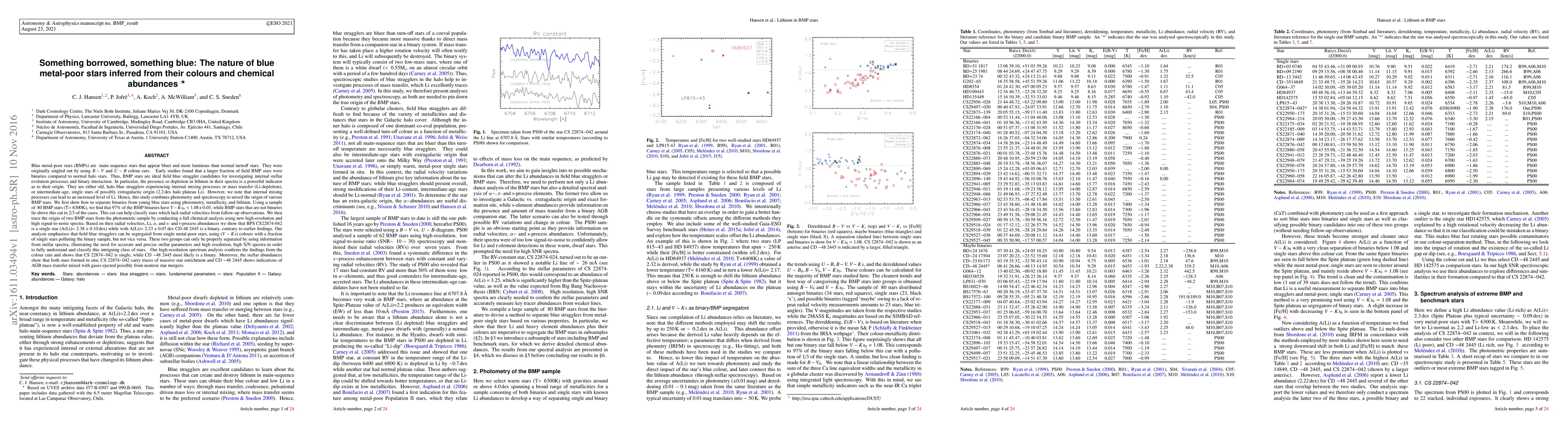 Blue metal-poor stars (BMPs) are main sequence stars that appear bluer and more luminous than normal turnoff stars. They were originally singled out by using B-V and U-B colour cuts. Early studies found that a larger fraction of field BMP stars were binaries compared to normal halo stars. Thus, BMP stars are ideal field blue straggler candidates for investigating internal stellar evolution processes and binary interaction. In particular, the presence or depletion in lithium in their spectra is a powerful indicator as to their origin. They are either old, halo blue stragglers experiencing internal mixing processes or mass transfer (Li-depletion), or intermediate-age, single stars of possibly extragalactic origin (2.2dex halo plateau Li). However, we note that internal mixing processes can lead to an increased level of Li. Hence, this study combines photometry and spectroscopy to unveil the origin of various BMP stars. We first show how to separate binaries from young blue stars using photometry, metallicity, and lithium. Using a sample of 80 BMP stars (T>6300K), we find that 97% of the BMP binaries have V-Ks_0 < 1.08$\pm0.03$, while BMP stars that are not binaries lie above this cut in 2/3 of the cases. This cut can help classify stars which lack radial velocities from follow-up observations. We trace the origin of two BMP stars from the photometric sample by conducting a full chemical analysis using new high-resolution and high SN spectra. Based on their radial velocities, Li, alpha, and s- and r-process abundances we show that BPS CS22874-042 is a single star (A(Li)$=2.38\pm0.10$dex) while with A(Li)$=2.23\pm0.07$dex CD-48 2445 is a binary, contrary to earlier findings. Our analysis emphasises that field blue stragglers can be segregated from single metal-poor stars, using V-Ks colours with a fraction of single stars polluting the binary sample, but not vice versa.(Abridged)