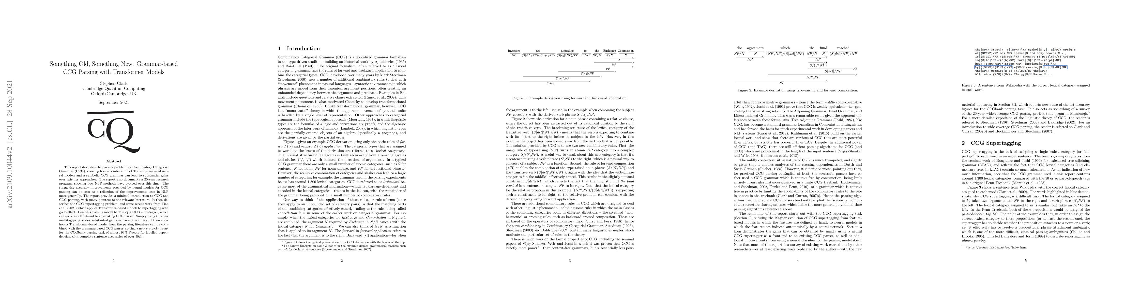 This paper combines Transformer-based neural models with Combinatory Categorial Grammar (CCG) to achieve significant improvements in CCG parsing accuracy, setting a new state-of-the-art with nearly 93% F-score for labelled dependencies and over 50% accuracy for complete sentences. The work builds on a 20-year evolution of NLP methods, highlighting the effectiveness of neural models in CCG parsing.