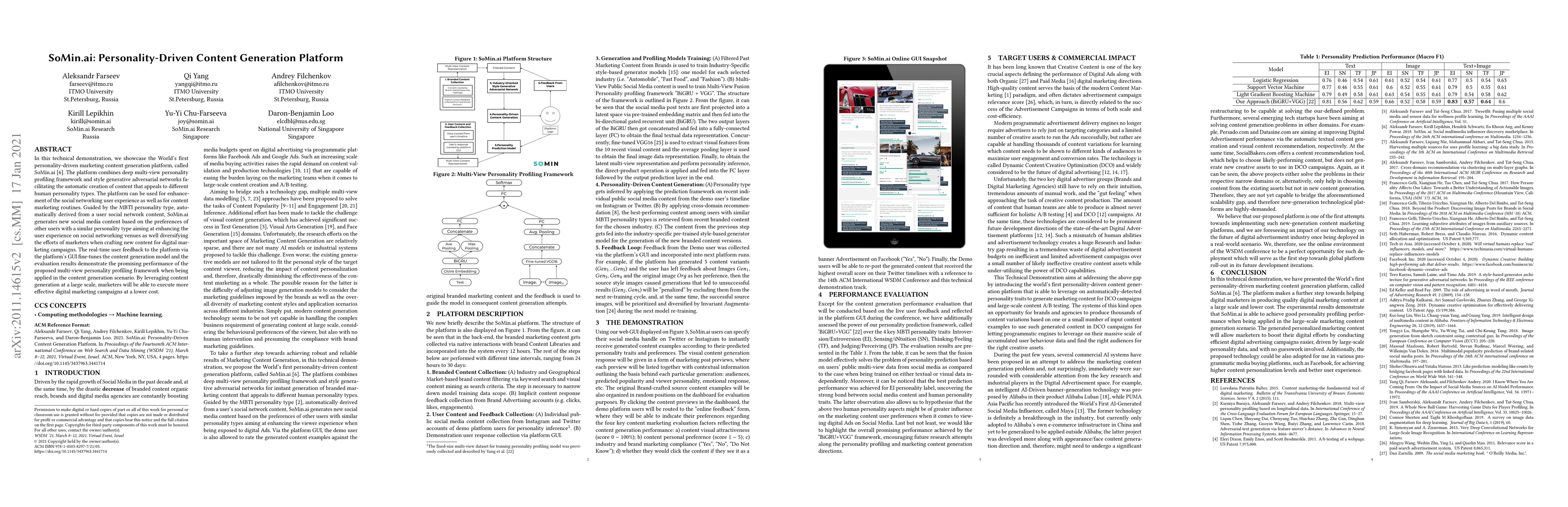 SoMin.ai is the world's first personality-driven marketing content generation platform that uses deep multi-view personality profiling and style generative adversarial networks to create appealing content for different personality types, enhancing user experience on social networks and aiding digital marketing campaigns. Real-time user feedback fine-tunes the model, showing promising results in content generation.