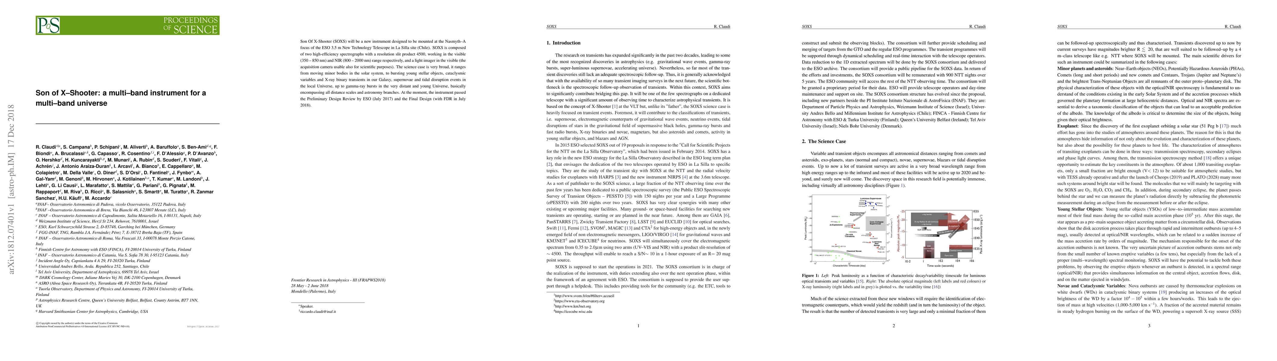 Son of X-Shooter (SOXS) is a new instrument for the ESO 3.5 m New Technology Telescope, designed to operate in both visible and NIR bands, with applications ranging from solar system bodies to distant gamma-ray bursts. The instrument has completed its design reviews and is set for installation.
