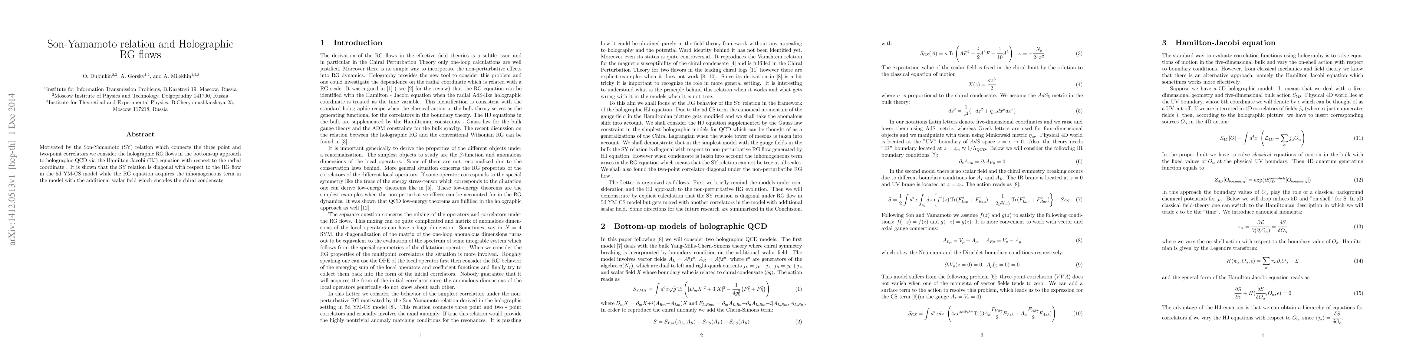 This paper explores holographic RG flows in holographic QCD, demonstrating that the Son-Yamamoto relation remains diagonal under the RG flow in a 5d Yang-Mills Chern-Simons model, while introducing a scalar field to encode the chiral condensate leads to an inhomogeneous term in the RG equation.