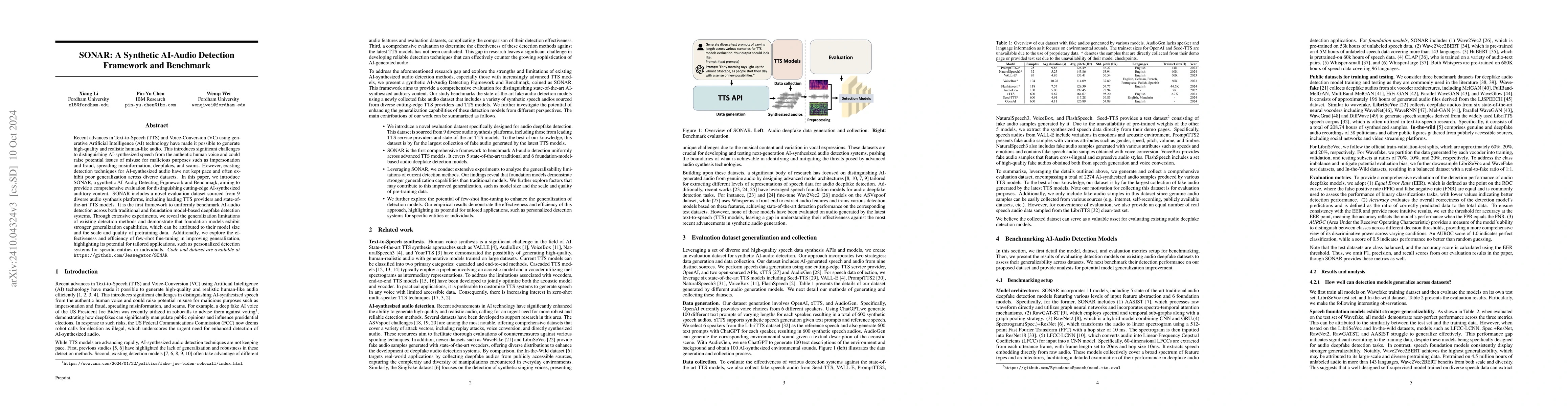 The paper introduces SONAR, a novel synthetic AI-Audio Detection Framework and Benchmark, aimed at addressing the challenge of distinguishing AI-synthesized speech from authentic human voices. The framework includes a comprehensive evaluation dataset from diverse synthesis platforms and demonstrates that foundation models outperform traditional detection systems due to larger size and better pretraining data, while also exploring the effectiveness of few-shot fine-tuning.