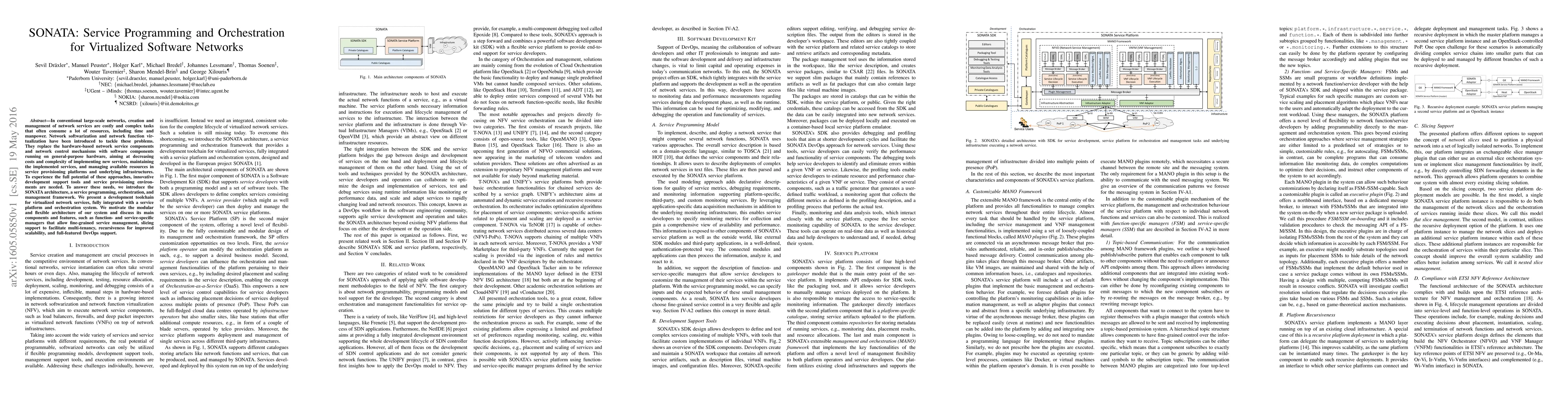 The SONATA architecture introduces a service programming and orchestration framework for virtualized software networks, aiming to simplify the creation and management of network services through software components on general-purpose hardware. It features a modular toolchain for service development, orchestration, and management, including fine-grained service control, multi-tenancy support, and comprehensive DevOps integration.