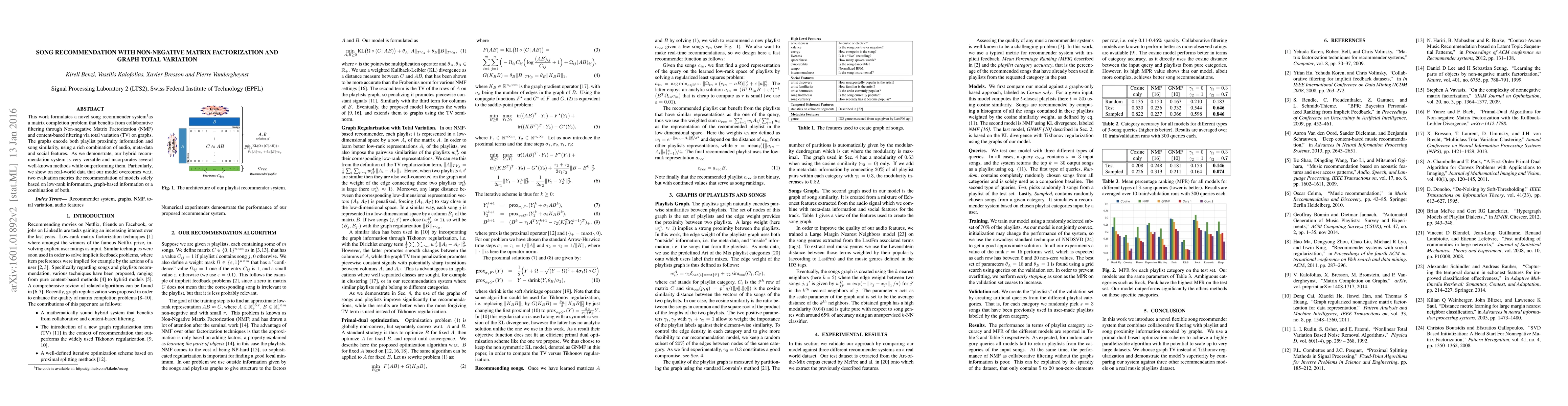 This paper proposes a hybrid song recommendation system using Non-negative Matrix Factorization (NMF) and Graph Total Variation (TV) to combine collaborative and content-based filtering. The system outperforms existing methods by integrating playlist and song data through rich audio, metadata, and social features.