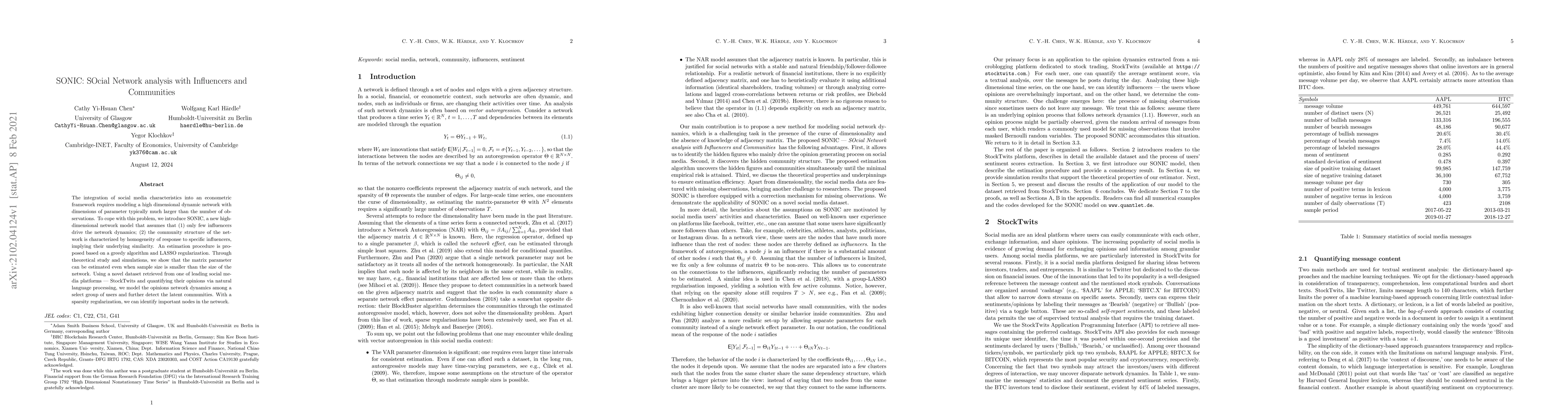 The paper introduces SONIC, a high-dimensional network model for social media that identifies influential nodes and latent communities. It employs a greedy algorithm and LASSO regularization to estimate parameters even when observations are fewer than network dimensions.