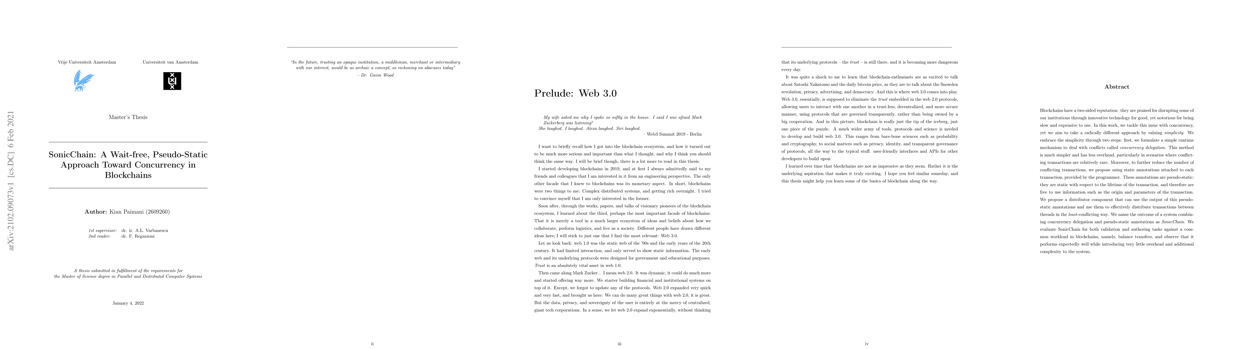 SonicChain introduces a wait-free, pseudo-static approach to enhance blockchain concurrency by using concurrency delegation and static annotations to reduce transaction conflicts. Evaluations show it performs well with minimal overhead.