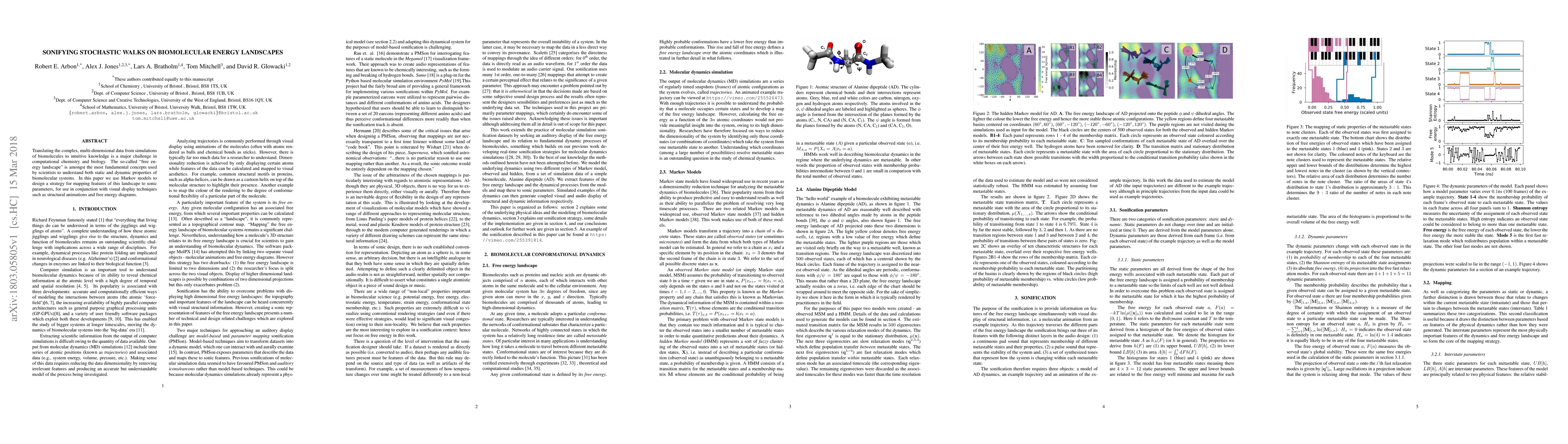 Translating the complex, multi-dimensional data from simulations of biomolecules to intuitive knowledge is a major challenge in computational chemistry and biology. The so-called "free energy landscape" is amongst the most fundamental concepts used by scientists to understand both static and dynamic properties of biomolecular systems. In this paper we use Markov models to design a strategy for mapping features of this landscape to sonic parameters, for use in conjunction with visual display techniques such as structural animations and free energy diagrams.