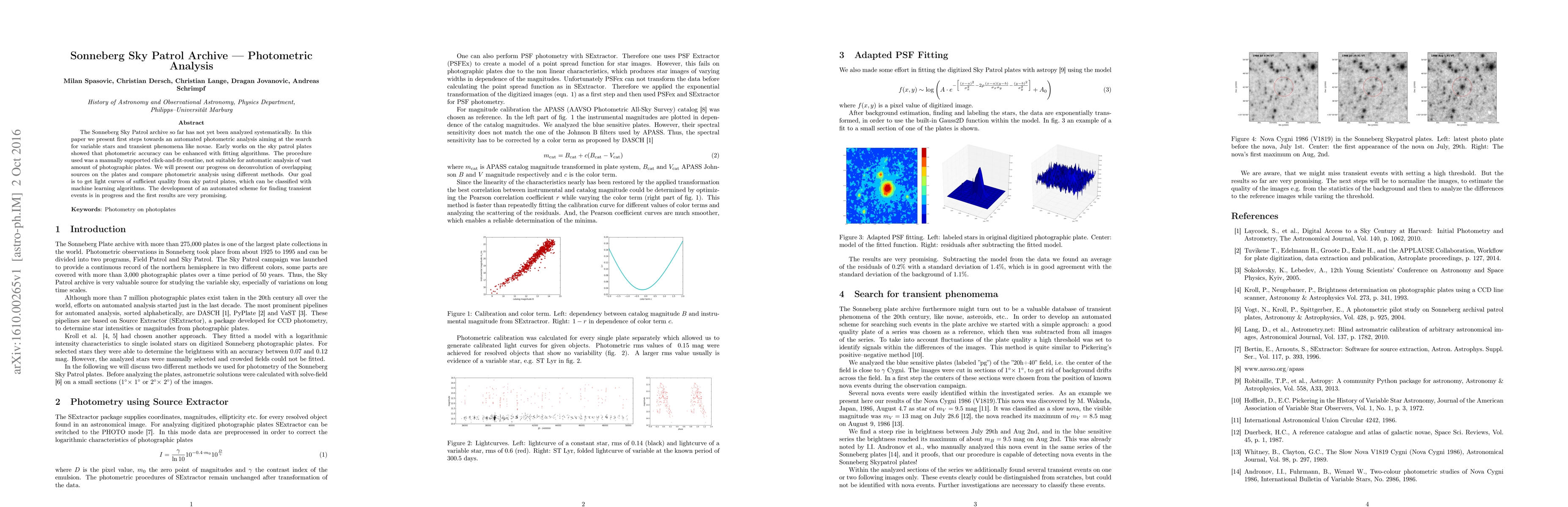 This paper introduces an automated photometric analysis of the Sonneberg Sky Patrol archive, focusing on detecting variable stars and transient phenomena. The authors develop methods for deconvolution and compare different analysis techniques to achieve high-quality light curves, aiming to classify them using machine learning for the identification of transient events.