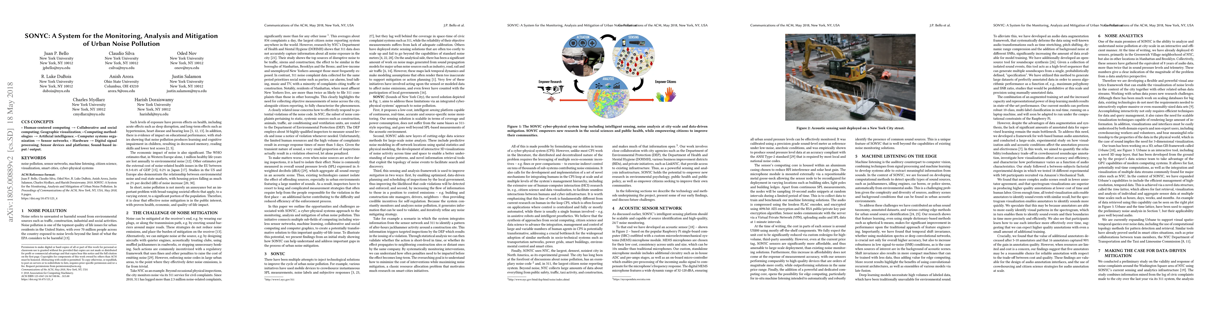 The SONYC project develops a cyber-physical system for monitoring, analyzing, and mitigating urban noise pollution in New York City, utilizing low-cost sensors and citizen science to create a comprehensive acoustic model and drive data-driven noise mitigation strategies. This system offers a scalable blueprint for addressing noise pollution in other urban areas.